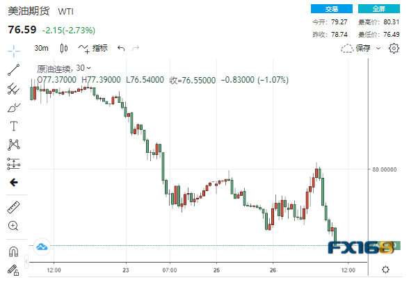 美市盘中,布伦特原油期货下跌3%,至82.64美元低点;WTI原油期货下跌逾3%,失守77美元关口,最低触及76.49美元。