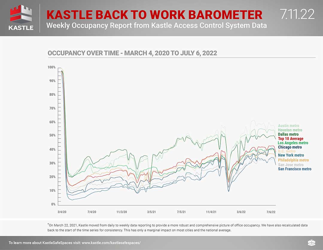 尽管证据尚属初步,但许多美国人似乎正通过减少通勤来应对汽油价格飙升。图片来源:Paul Weaver/Zuma Press当然,很难准确区分通勤减少在多大程度上源于更多人染疫(新冠最新变种BA.5传染性极强,每日新增病例超10万例,实际数字可能更高因许多人居家检测),还是油价冲击所致。Kastle Systems数据显示,自2020年4月低谷以来,办公室使用率呈波动回升,大幅下滑与疫情波峰高度吻合。