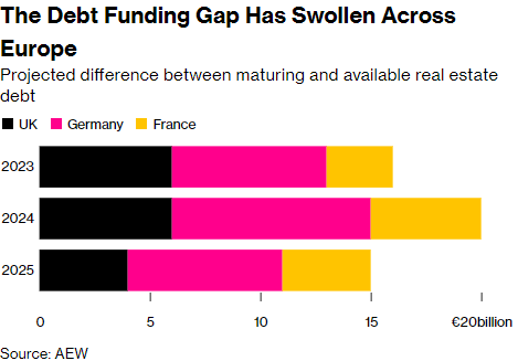 欧洲房东面临的 最新困扰 是需要重新融资债务--以及他们的贷款人。 研究人员表示,德国、法国和英国商业地产所有者欠款金额与到期时可能用于再融资的信贷之间存在510亿欧元的差距,其中320亿欧元的缺口主要是由价格下跌引起的。