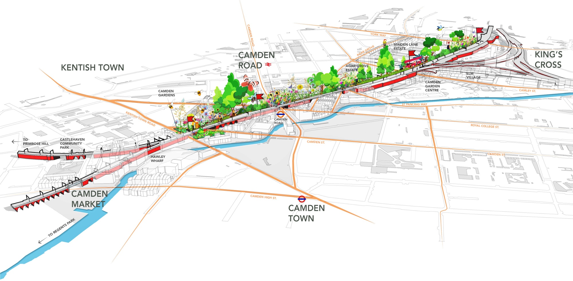 卡姆登高线沿着伦敦中心以北的一条长1.2公里(大约¾英里)的路径延伸,该名称也直接源自曼哈顿著名的线性公园 — 两个项目共享相同的首席建筑师: 詹姆斯·康纳田田园规划。
