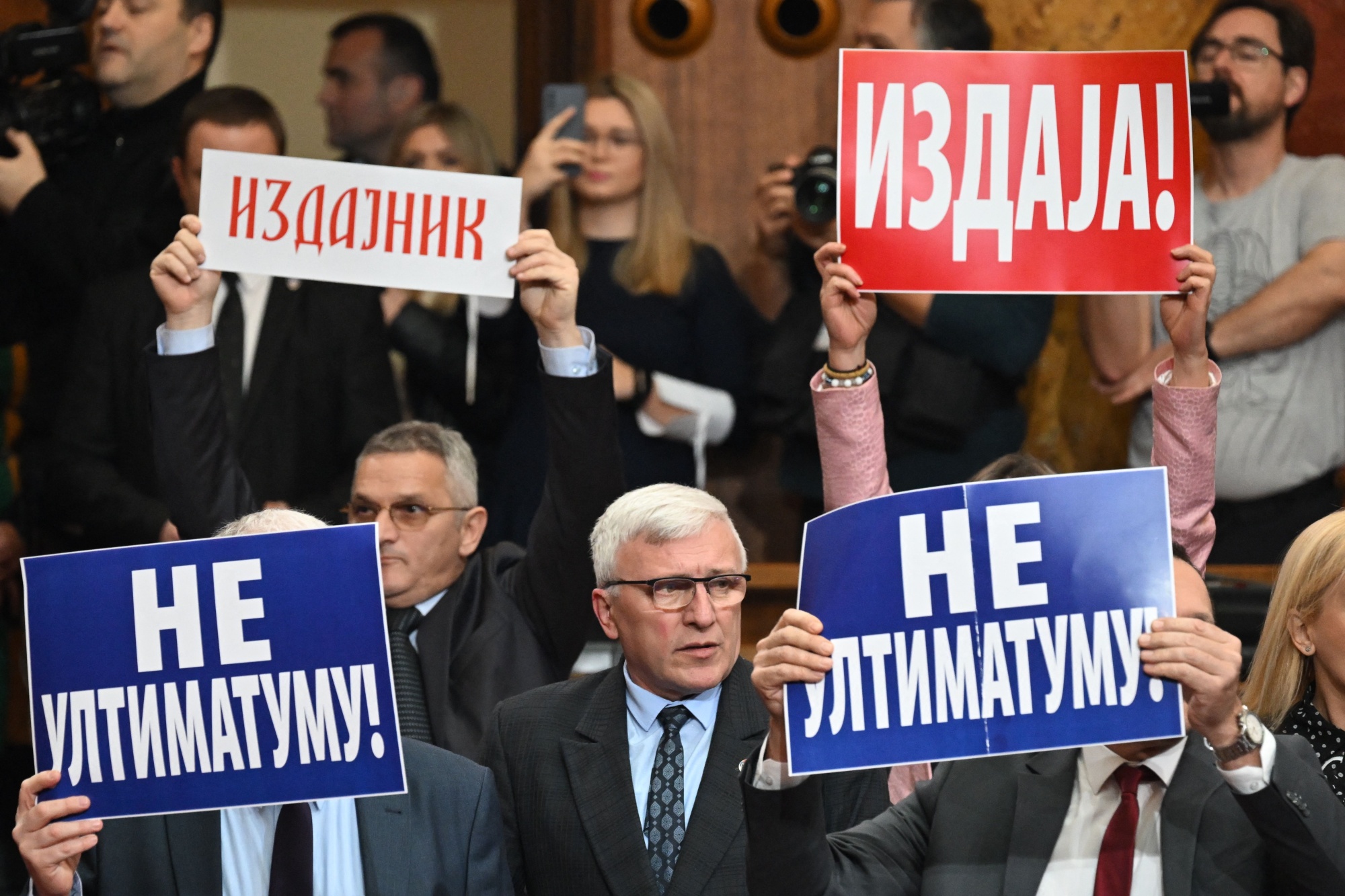 身着西装的立法者在贝尔格莱德议会大厅地板上争吵,横幅上写着“反对屈服”和“叛国”,暴露了塞尔维亚领导人在寻求与科索沃达成协议而不是冒险让国家加入欧盟时将面临的阻力。