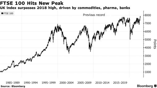 英国蓝筹股今天创下有史以来的最高纪录,这是自2018年以来的首次。富时100指数上涨了多达0.9%,因为英镑在美元强劲就业数据推动下下跌。