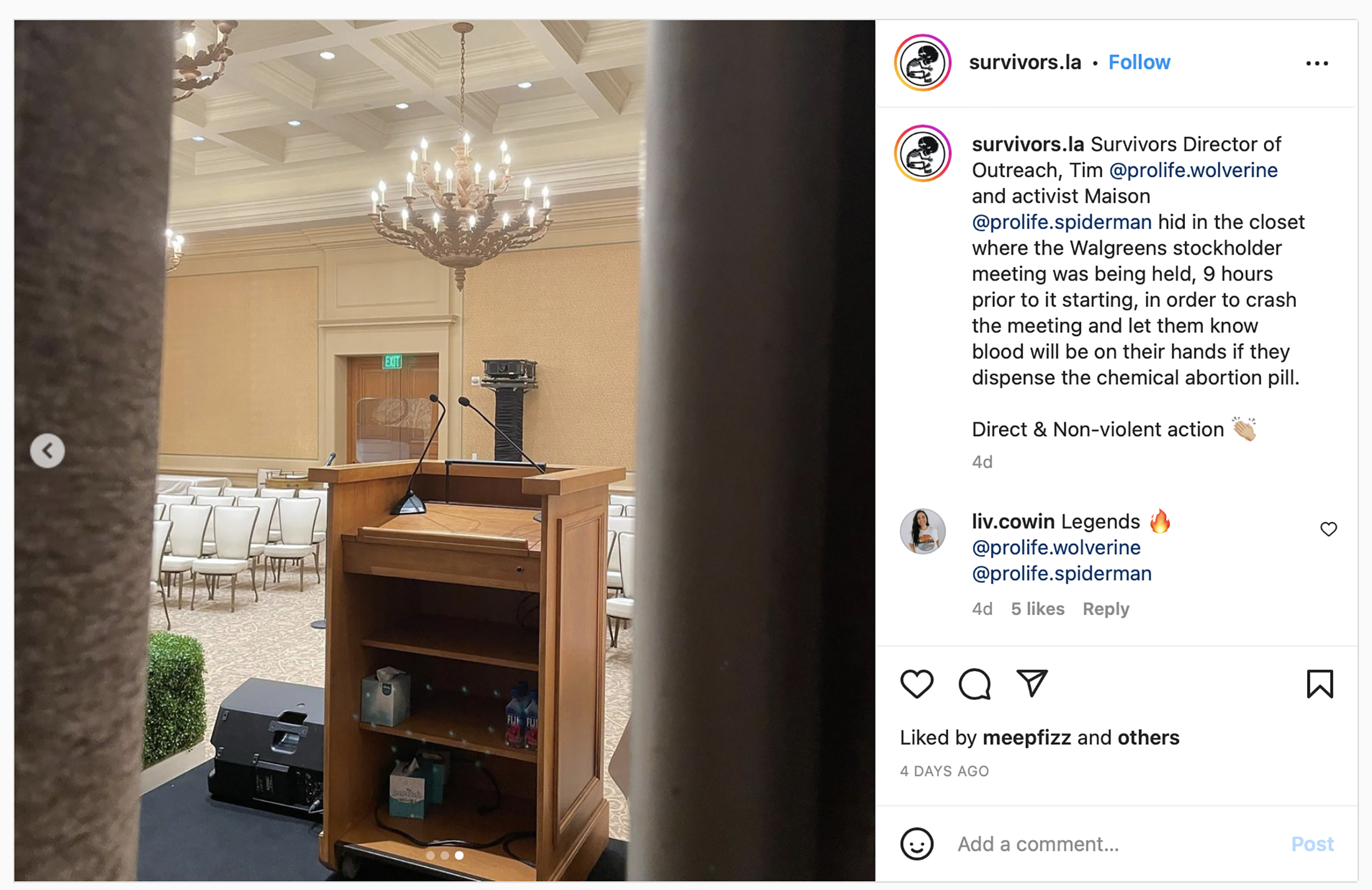 年度会议通常是乏味的事务,充斥着审计报告和关于公司财务状况的PowerPoints。但1月26日在加利福尼亚新港海岸度假胜地举行的 Walgreens Boots Alliance Inc. 股东大会却丝毫不寻常,因为约80名反堕胎活动人士与 现场行动 组织一起前来抗议该公司决定分发用于终止妊娠的药物。一小部分抗议者——包括两名来自另一个反堕胎团体的人士,他们声称在会议室附近的壁橱里藏了九个小时,以便“让他们知道他们的手上会沾满鲜血”——从讲台后面冲出,而其他手持标语的人则在会场大门外示威。Walgreens为抗议者设立了一个室外区域,称感激在“干扰行动”中没有人受伤。