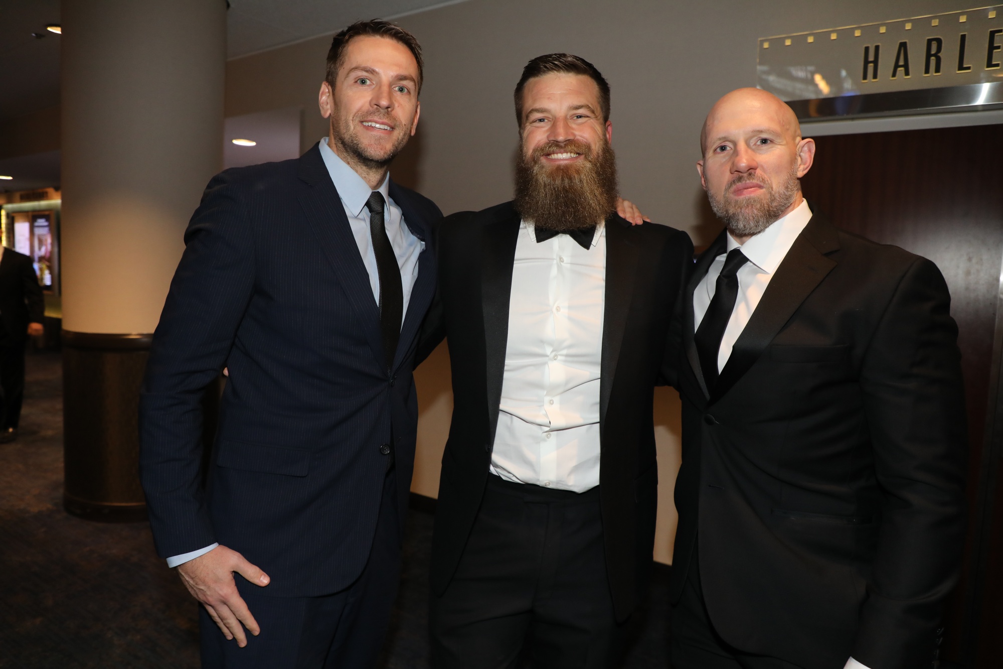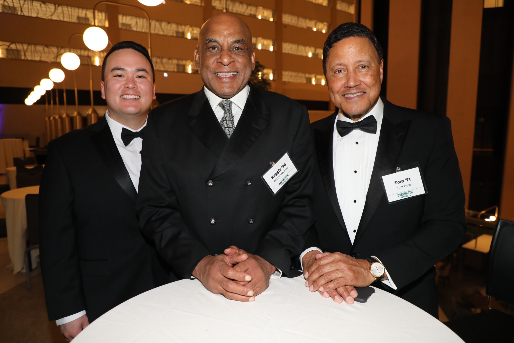 瑞安·菲茨帕特里克,中间,与同为哈佛校友的布拉德·威尔福德和布兰登·比布罗。摄影师:阿曼达·戈登/彭博社在常春藤足球协会晚宴上,超过1000名前球员聚集在一起,每所八所学校都表彰了自己的一员。对自己学院的忠诚是强烈的。对老鹰队或酋长队的忠诚则不那么强烈。