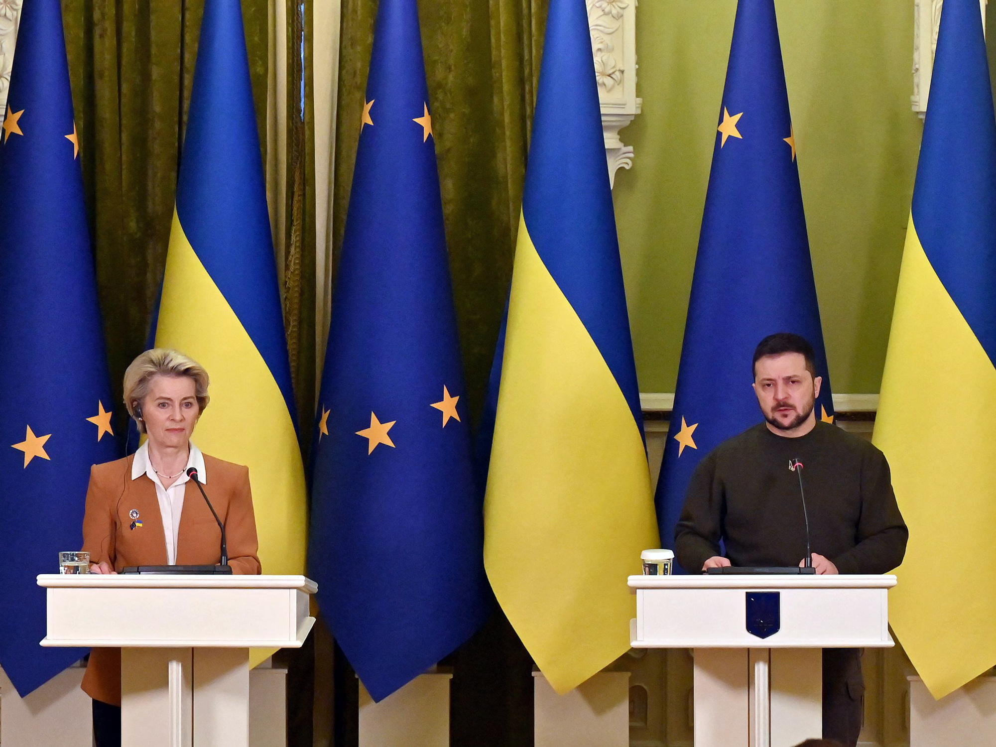 弗拉基米尔·泽连斯基和乌苏拉·冯·德·莱恩在基辅。摄影师:谢尔盖·苏平斯基/法新社/盖蒂图片社乌克兰总统弗拉基米尔·泽连斯基敦促更深入地融入欧洲联盟,因为他试图鼓舞他的国家应对俄罗斯预期的军事进攻。