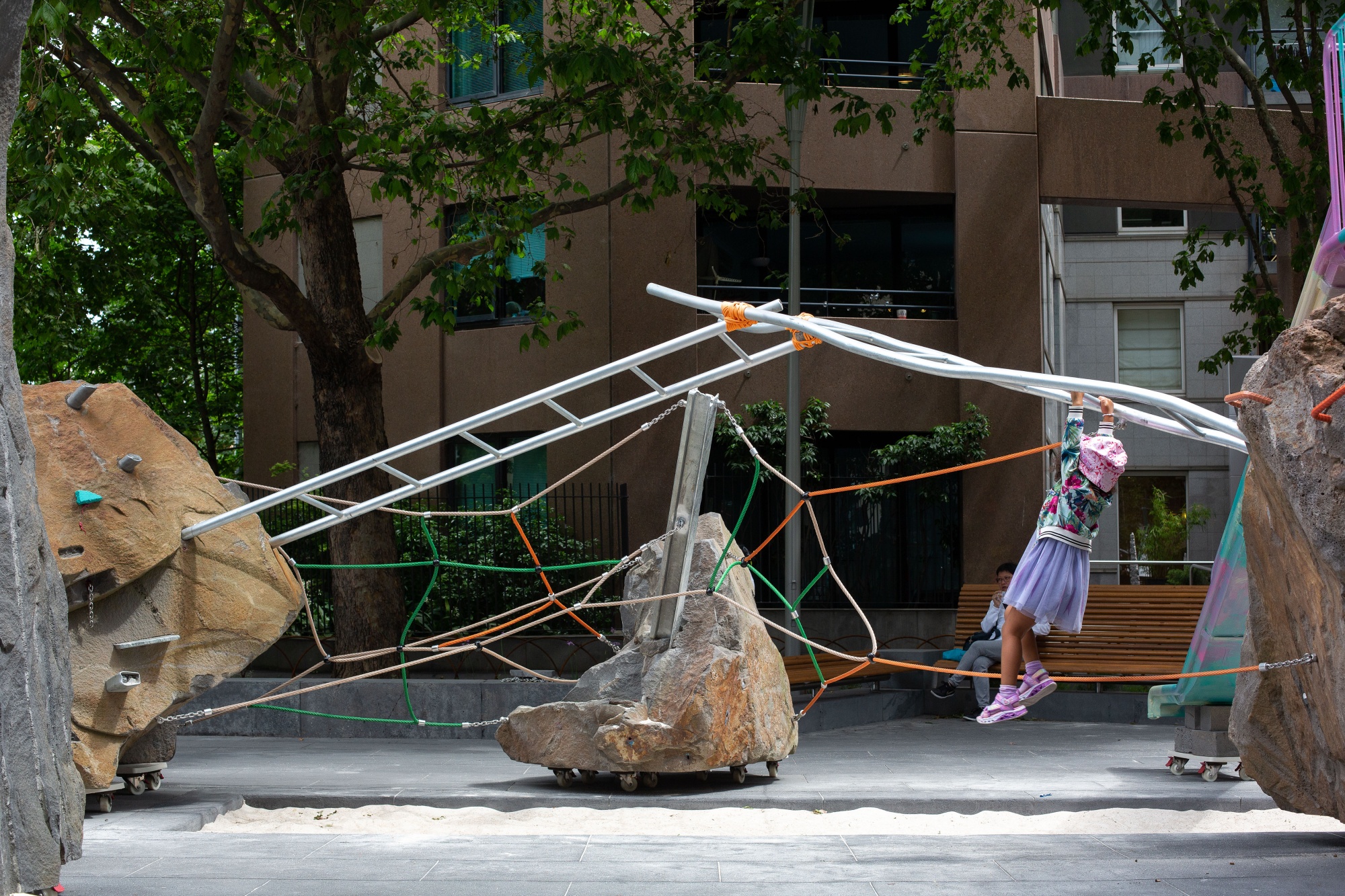 墨尔本的Southbank游乐场建在巨大的蓝石巨石周围,这些巨石坐落在装有轮子的小推车上。照片由Mike Hewson提供这个游乐场是新西兰艺术家兼工程师Mike Hewson的最新作品,他因为设计给孩子们玩的看起来极具危险性的游乐空间而享有一定的声誉。除了Southbank的这个之外,他还在澳大利亚建造了另外三个游乐场,所有这些游乐场都有奇特而古怪的结构,邀请人们探索和(经过计算的)冒险。一个堆满彩色桶子支撑着秋千、梯子和绳索;另一个中有一棵活的棕榈树从一个巨石中伸出;第三个中的砖石似乎快要倾倒。孩子们爬上没有固定的木材、看起来摇摇欲坠的一堆砖块和用橡皮筋绑在一起的攀岩墙。