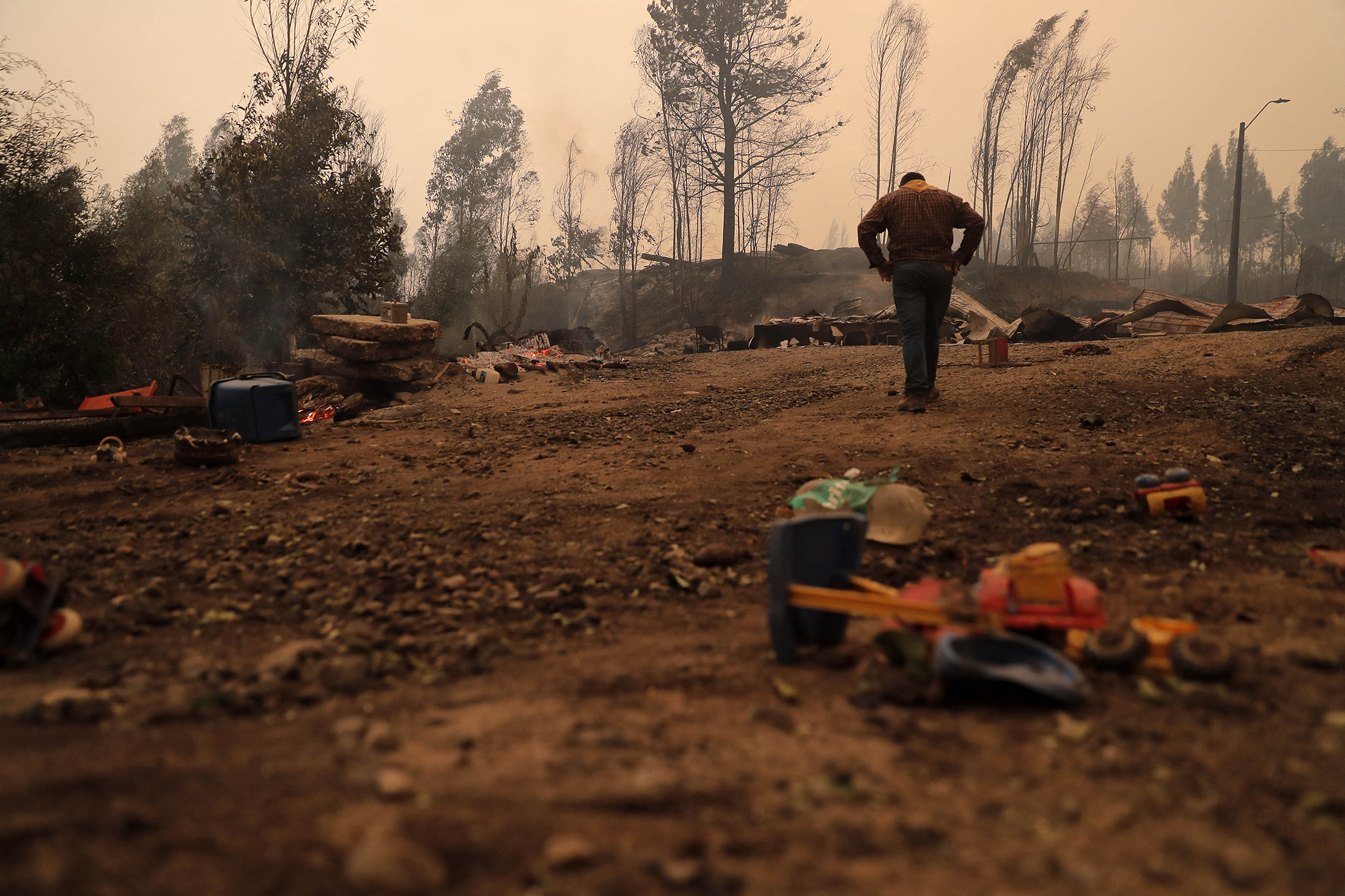一名居民在智利康塞普西翁省圣胡安遭受野火破坏后进行调查,日期为2月3日。