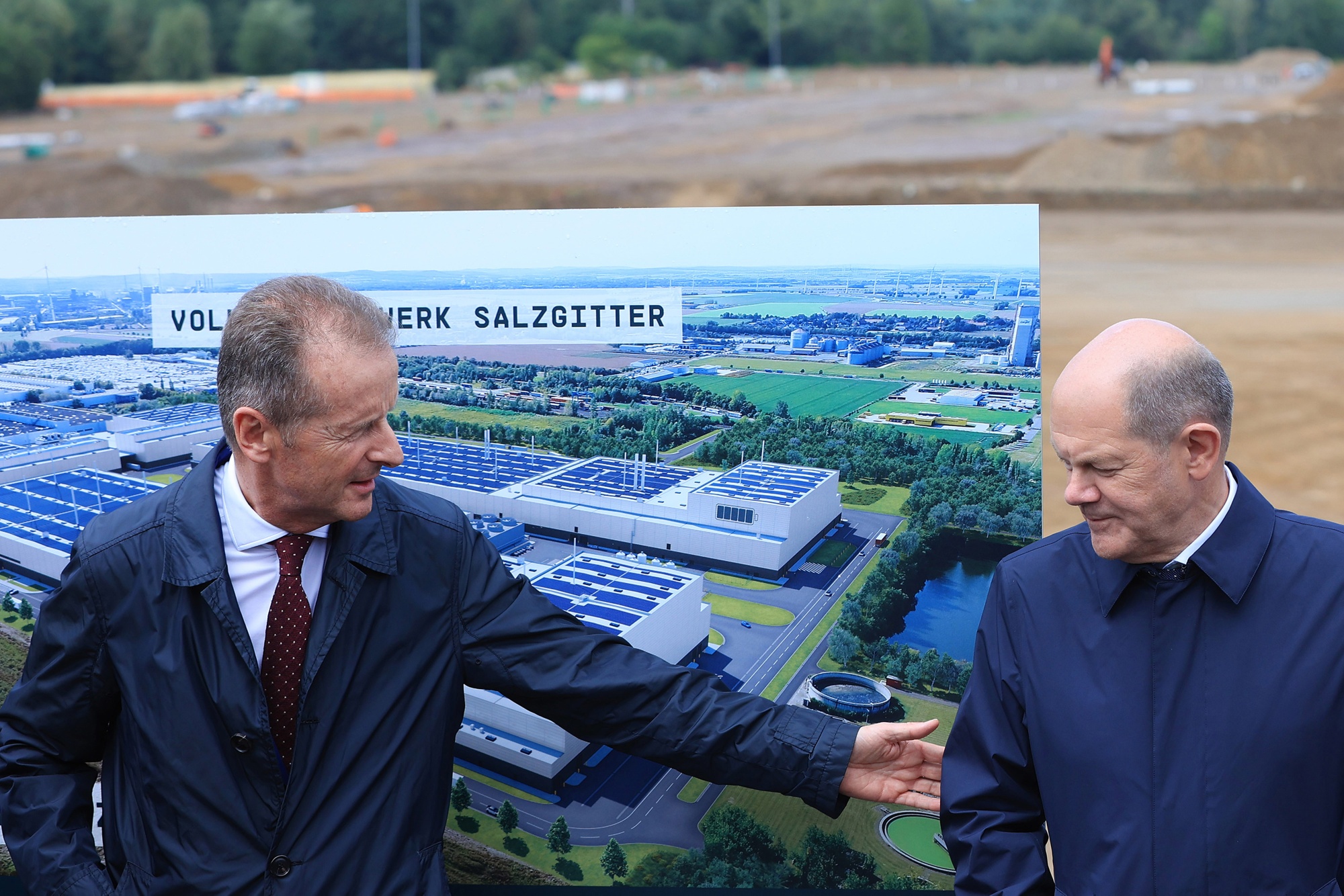 大众汽车股份公司首席执行官赫伯特·迪斯和肖尔茨在SalzGiga燃料电池超级工厂的仪式上。摄影师:克里斯蒂安·博克西/彭博社肖尔茨需要私营部门的投资来帮助德国摆脱煤炭、天然气和核能,这意味着将德国打造成下一代公司的目的地。更加复杂的是,他必须在应对欧盟补贴限制和德国自身庞大官僚体系的同时,说服一个受疫情和战争折磨的公众接受一个不受欢迎的事实——转向更加绿色、清洁的世界不会不牺牲一些繁荣。