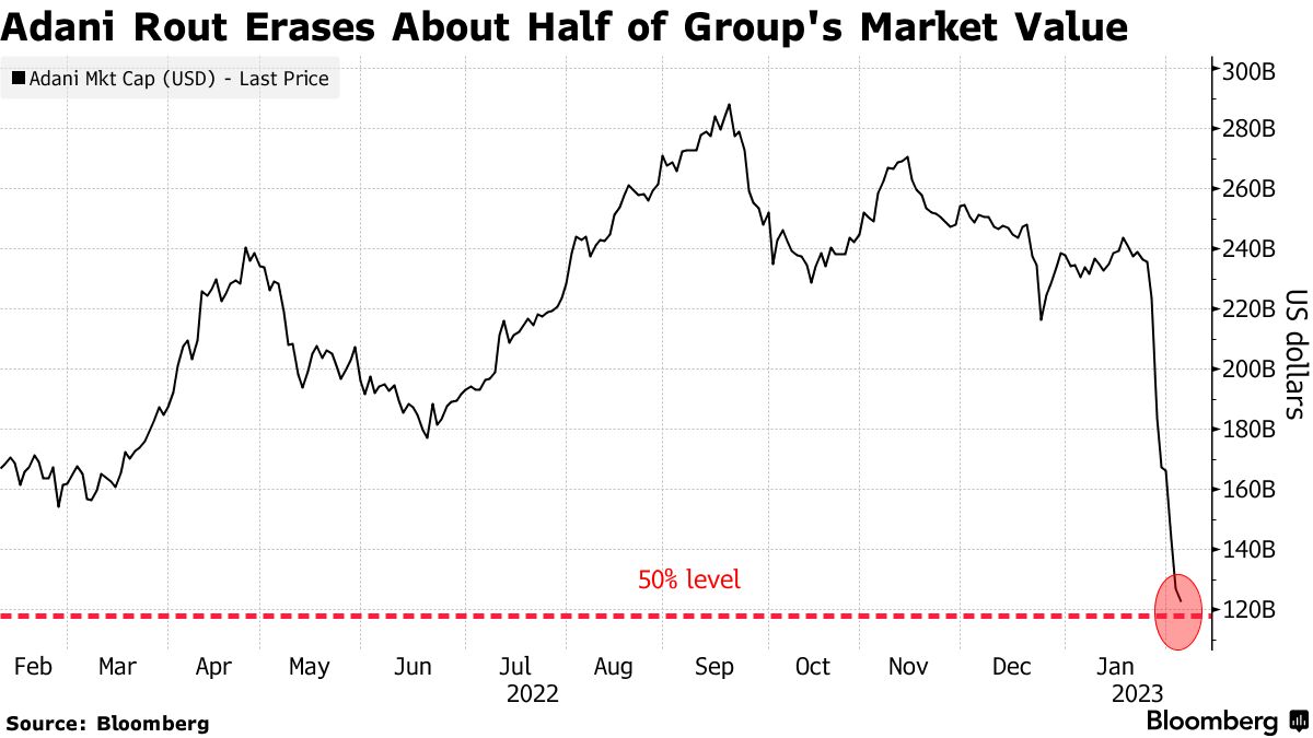 自1月24日美国空头机构Hindenburg Research发布了一份严厉的报告指控阿达尼集团操纵股票和会计欺诈以来,阿达尼帝国的市值已经下跌了近一半。该集团一再否认Hindenburg的有关公司不端行为的指控,并威胁采取法律行动。