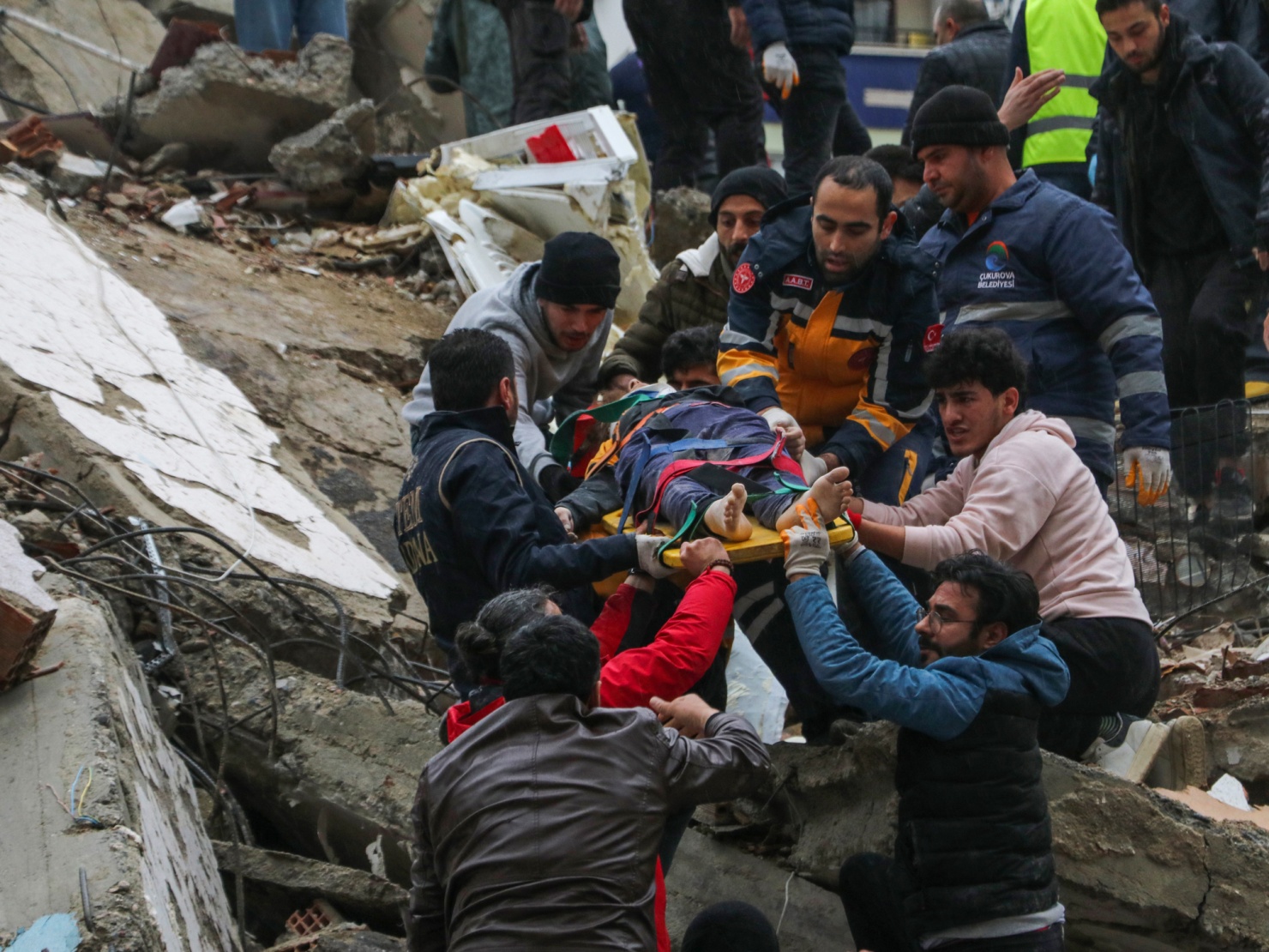人们和紧急救援队员在2023年2月6日救出一名被困在土耳其阿达纳市倒塌建筑中的人。 来源:IHA Agency via AP