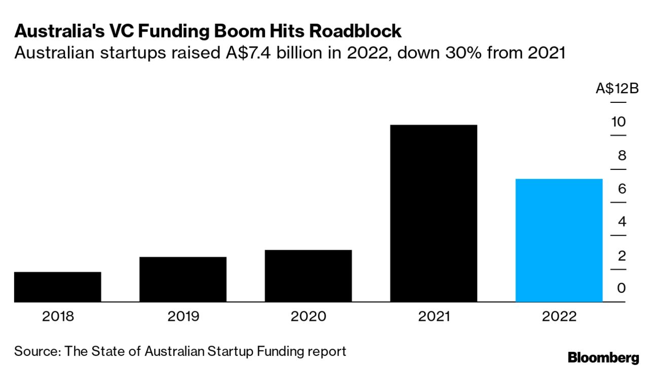 风险投资降温: 对澳大利亚初创企业的投资暴跌了2022年的三分之一,降至74亿澳元,紧随全球科技公司和风险市场的步伐。