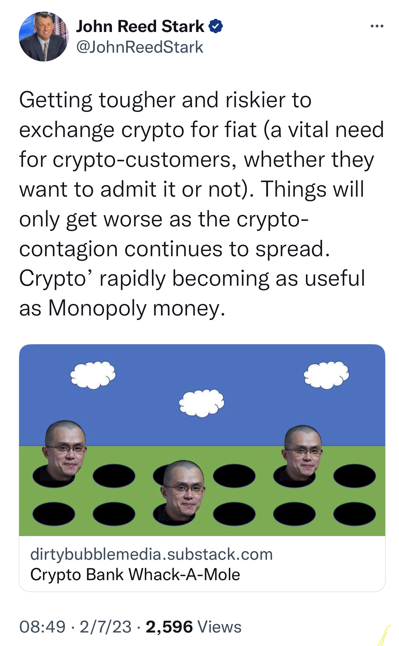 来源: @JohnReedStark](https://twitter.com/JohnReedStark/status/1622955642326777859)在美国,Silvergate Capital、Signature和Metropolitan Bank这三家银行扮演着处理大部分美元存款到加密平台的重要角色。现在,它们正受到各方面的压力,要摆脱加密混乱。