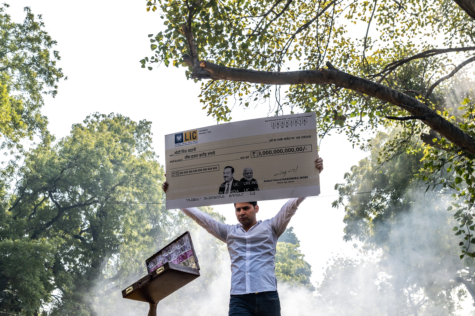 一名抗议者在印度主要反对党国大党组织的示威活动中手持一张描绘Gautam Adani和Narendra Modi的模拟支票,活动于2023年2月6日星期一在印度新德里举行。摄影师:Anindito Mukherjee/Bloomberg60岁的Adani与总理Narendra Modi有数十年的交情。他的业务涉及资本密集型项目,如机场、发电厂和数据中心,处于莫迪的增长议程的核心。作为一位国家冠军,这位大亨将他的商业利益与莫迪的发展目标保持一致,经常在国家资源或能力不足的地方介入,从而创造了成千上万个就业机会。