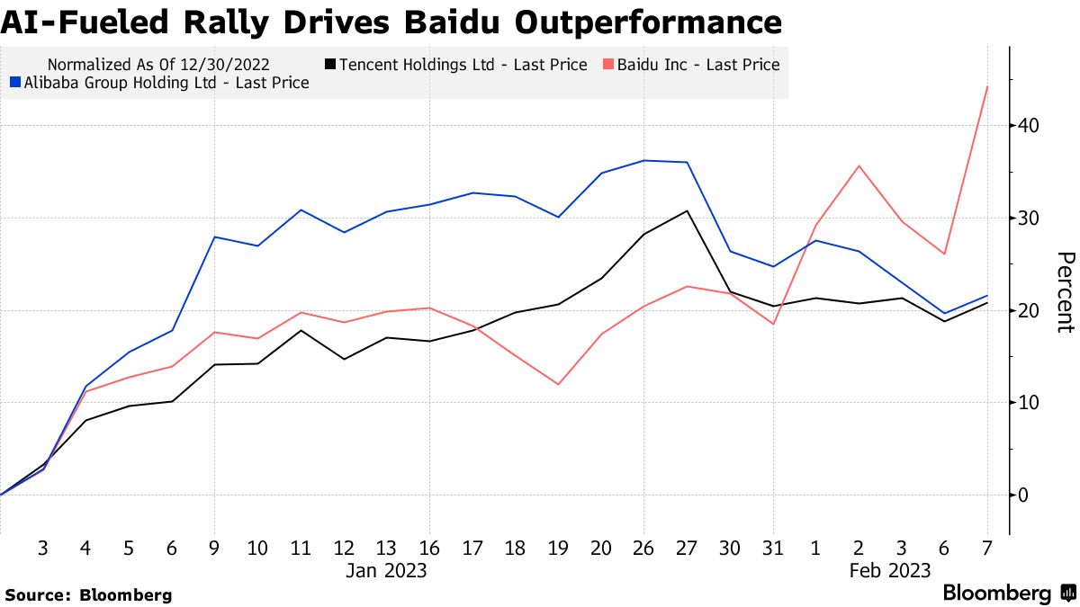 今年,这家公司在香港股市上涨了45%,其中包括周二的15%的涨幅,这是中国最大的搜索引擎表示将于三月推出其人工智能聊天机器人后的涨幅。这一举措,可能是该国最重要的进入下一个大事件,已经将百度股票推至超买区,其涨幅超过了竞争对手阿里巴巴集团控股有限公司和腾讯控股有限公司。