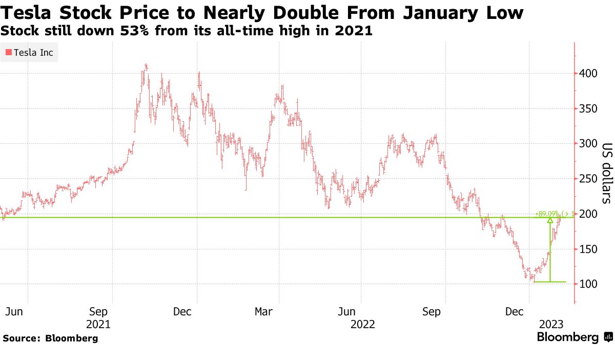特斯拉公司,准备连续第六个交易日上涨,从一月份的最低价101.81美元上涨了91%。这一涨幅是在这家电动汽车制造商上周五晚间提高了其在美国的Model Y SUV价格之后,首席执行官埃隆·马斯克被一家联邦陪审团裁定清白,该陪审团指控他欺诈股东。