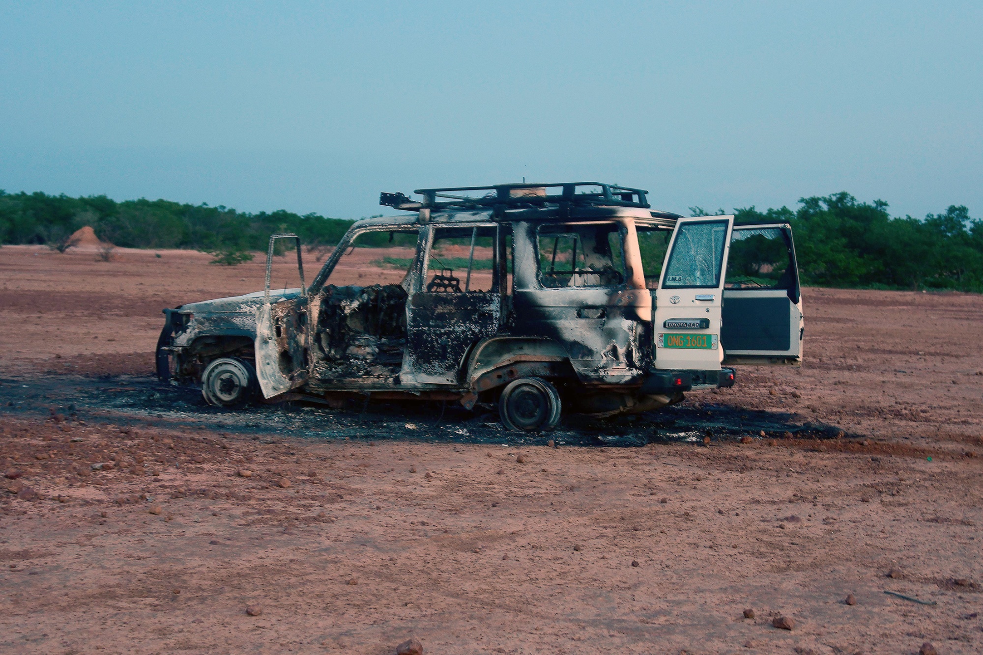 在2020年,尼日尔一辆汽车的残骸,援助工作者、当地向导和司机被不明身份的枪手杀害。