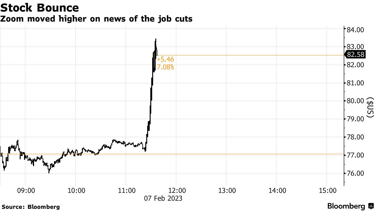 这次裁员所占员工总数比Salesforce Inc.、Microsoft Corp.和Workday Inc.等企业软件公司宣布的裁员规模更大。Zoom股价在纽约收盘时上涨了9.9%,达到84.66美元,为三个月来的最大单日涨幅。尽管周二股价上涨,但自2020年10月创下历史最高点以来,股价已经暴跌了85%,现在回到了疫情前的水平。