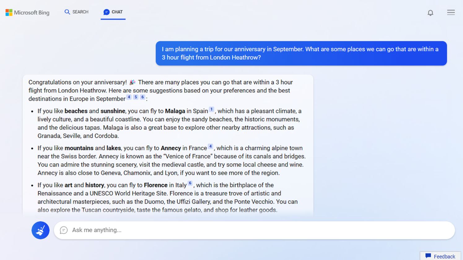 新的Bing搜索查询框可以接受多达1,000个字符。在一次演示中,微软副总裁Yusuf Mehdi询问基于聊天的引擎有关亚利桑那州斯科茨代尔在本周末超级碗期间的活动。新的Bing返回了有关超级碗周派对、烹饪活动和其他相关活动的信息。这种升级版服务还可以估算宜家情侣沙发是否适合2019年本田奥德赛——Bing告诉Mehdi它不确定,这取决于车辆的第二排和第三排是否折叠。