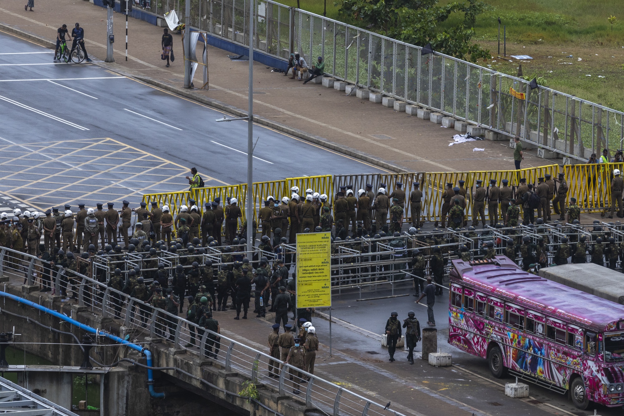 军队成员在2022年7月,在科伦坡总统办公室外拆除抗议者营地后,在新建的街道路障附近。摄影师:Buddhika Weerasinghe/Bloomberg这位领导人依赖于拉贾帕克萨家族仍掌权的斯里兰卡波杜贾纳佩拉穆纳党议员的支持。当国家于3月9日举行地方政府选举时,政府将面临其批准的关键考验。