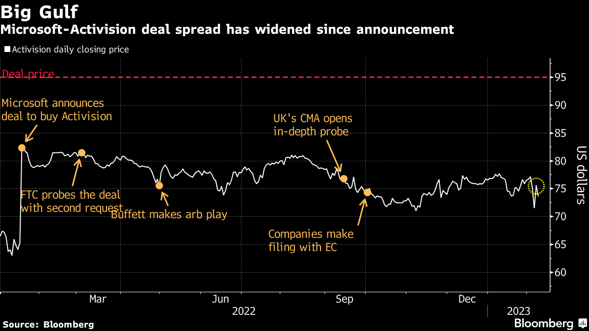 华尔街对该合并获批的可能性日益持怀疑态度。在英国竞争与市场局势管理局宣布后,周三,动视暴雪的股价下跌了多达4.2%,至72.45美元,距离微软每股95美元的现金报价几乎下跌了24%。目前,市场认为该交易完成的概率在10%至30%之间,Cowen & Co的并购套利专家Aaron Glick表示。
