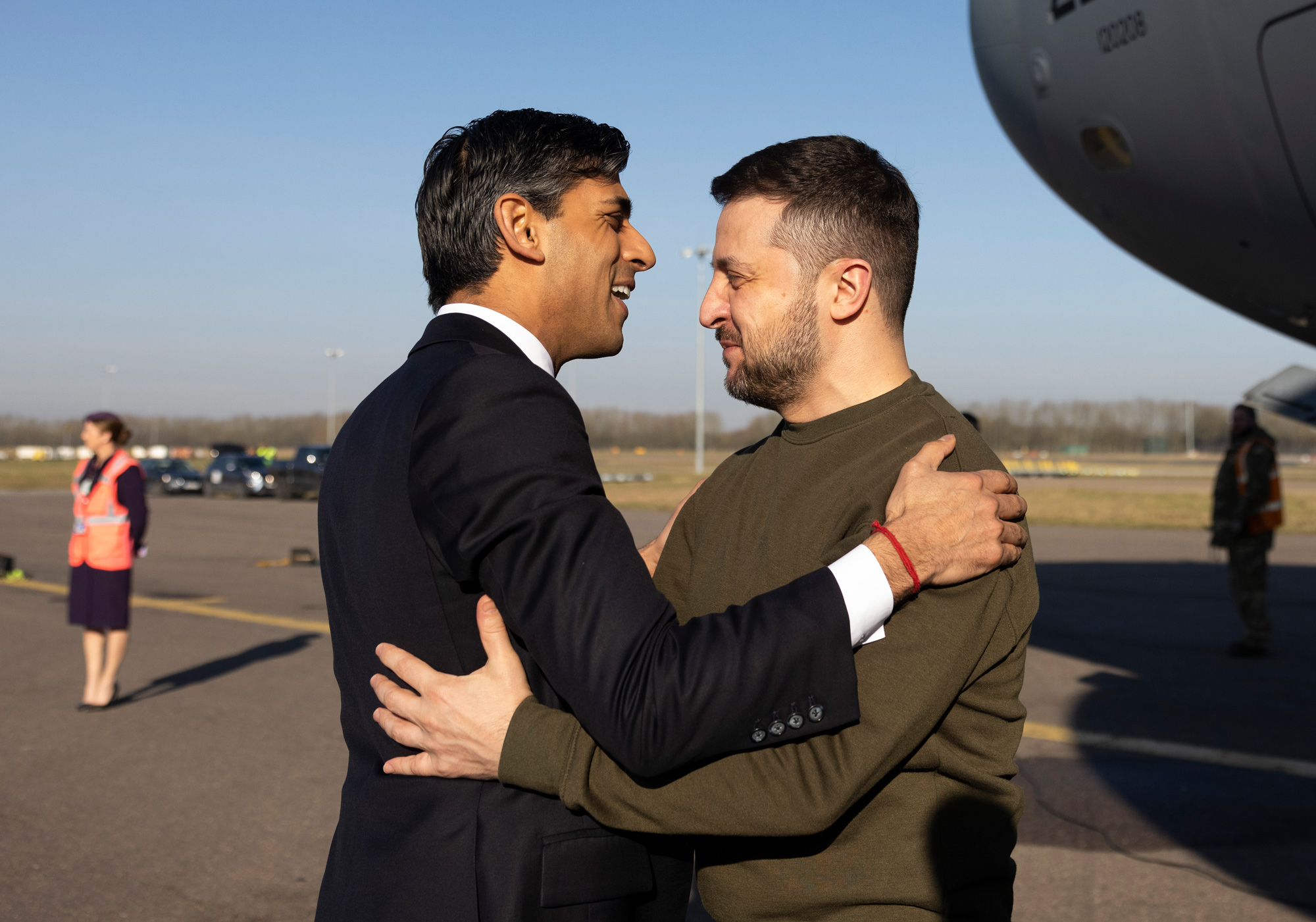弗拉基米尔·泽连斯基,右边,于2月8日在斯坦斯特德机场受到里希·苏纳克的欢迎。摄影师:西蒙·道森/10号唐宁街在首相答辩前,里希·苏纳克带着泽连斯基走进唐宁街,护送这位首位活跃的战争领导人穿过黑门,这是相当长时间以来的第一次。接下来,泽连斯基总统在西敏大厅向数百名站立的议员发表讲话,这是他们几个小时前还不知道的事情,将被人们反复观看多年。