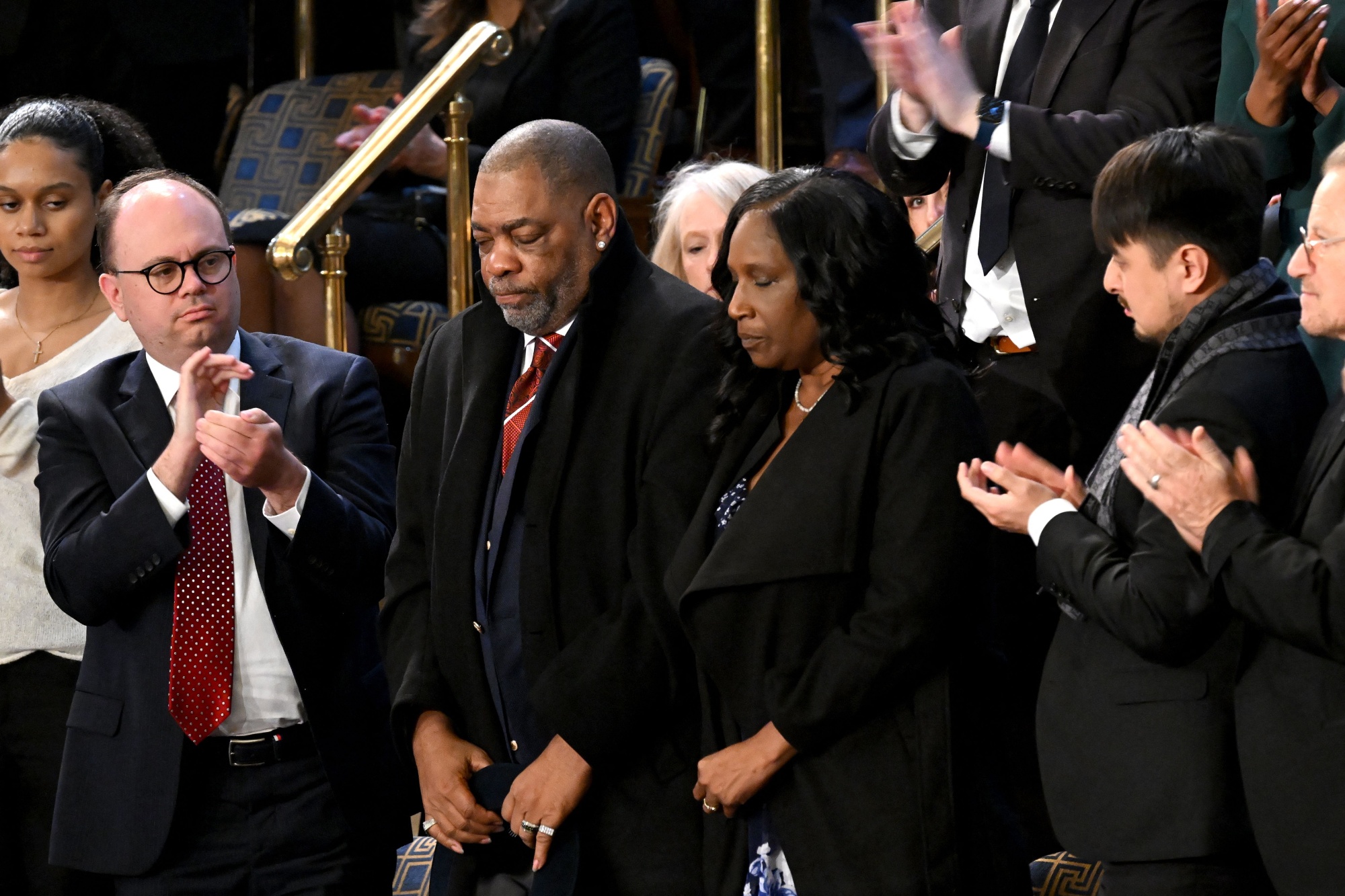 RowVaughn 和 Rodney Wells,Tyre Nichols 的母亲和继父,在2月7日的国情咨文演讲期间。摄影师:SAUL LOEB/AFP国会黑人议员会在国情咨文演讲中佩戴“1870”徽章,以纪念黑人被警察杀害的事件。