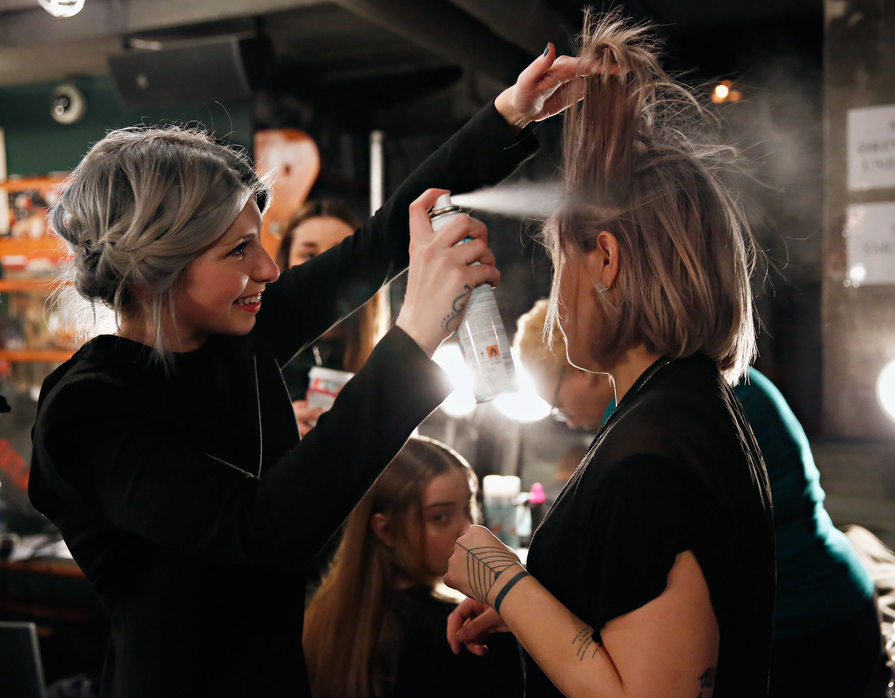 一位发型师在纽约哈德逊酒店的时装发布会后台使用干洗发水。嘿,我是弗吉尼亚的安娜。我们很多人都想要我们的干洗发水,但首先…