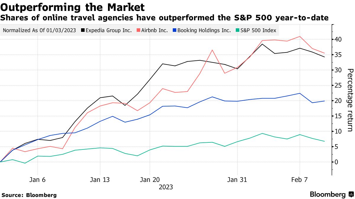 Expedia是首家报告2022年最后三个月业绩的主要在线旅行公司。其股价上涨使其成为截至周四标普500指数中表现第13好的股票。报告业绩日期为2月14日的Airbnb Inc.股价在2023年上涨了约34%,而报告日期为2月23日的Booking Holdings Inc.股价上涨了约21%。