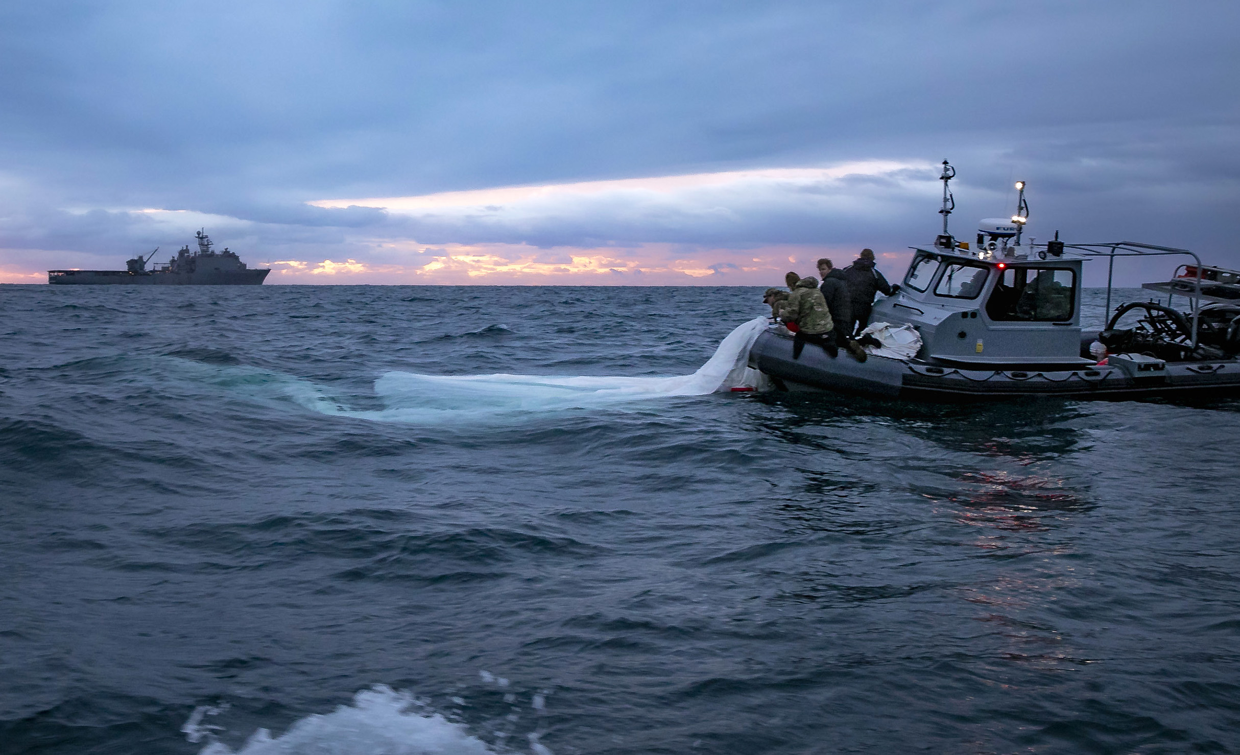 水手们于2月5日在南卡罗来纳州默特尔比奇海岸附近找回了高空监视气球。
