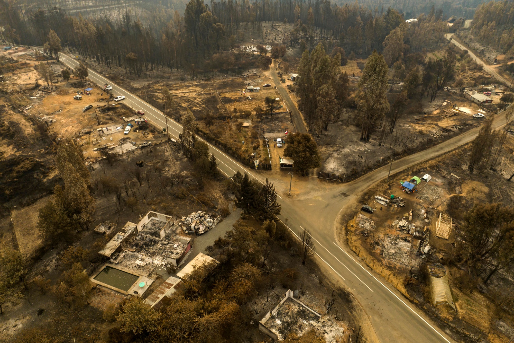 圣胡安纳,智利康塞普西翁省森林火灾造成的损害的航拍视图,日期为2月9日。