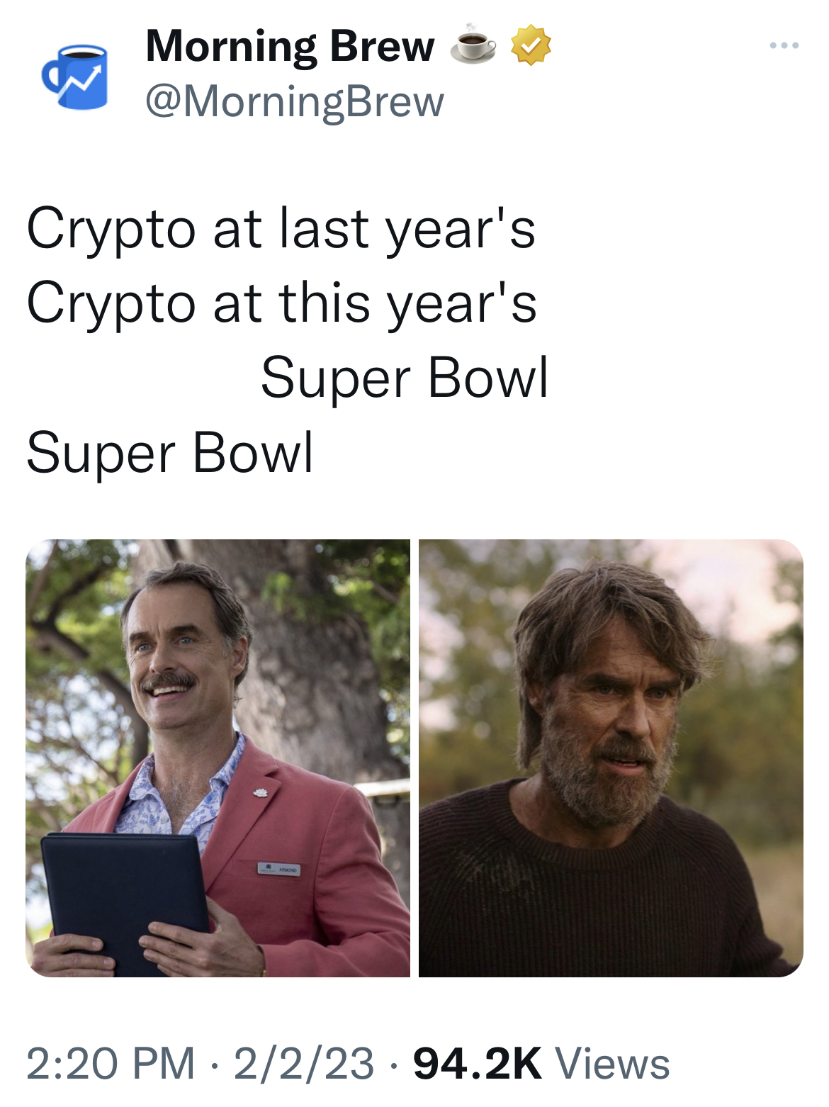 来源: @MorningBrew](https://twitter.com/MorningBrew/status/1621226948847603713)所以今年,又回到了啤酒和卡车广告;加密公司预计在这个星期天的电视上将像汤姆·布雷迪一样引人注目地缺席。事实证明,有时候幸运更青睐怀疑和风险规避者。但幻想,似乎总是在等待中。