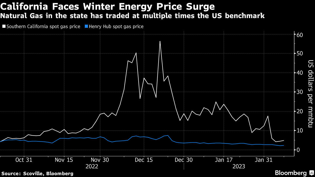 加利福尼亚依赖跨州管道进口超过95% 的供应。其中很多来自新墨西哥州和德克萨斯州的Permian盆地,那里的生产商有时会支付买家接受他们的天然气,因为有限的管道容量导致供应滞留在该地区。问题加剧了2021年在亚利桑那州库利奇发生的致命爆炸造成的持续中断,该爆炸影响了由 Kinder Morgan Inc. 管理的供应洛杉矶地区的庞大管道网络。