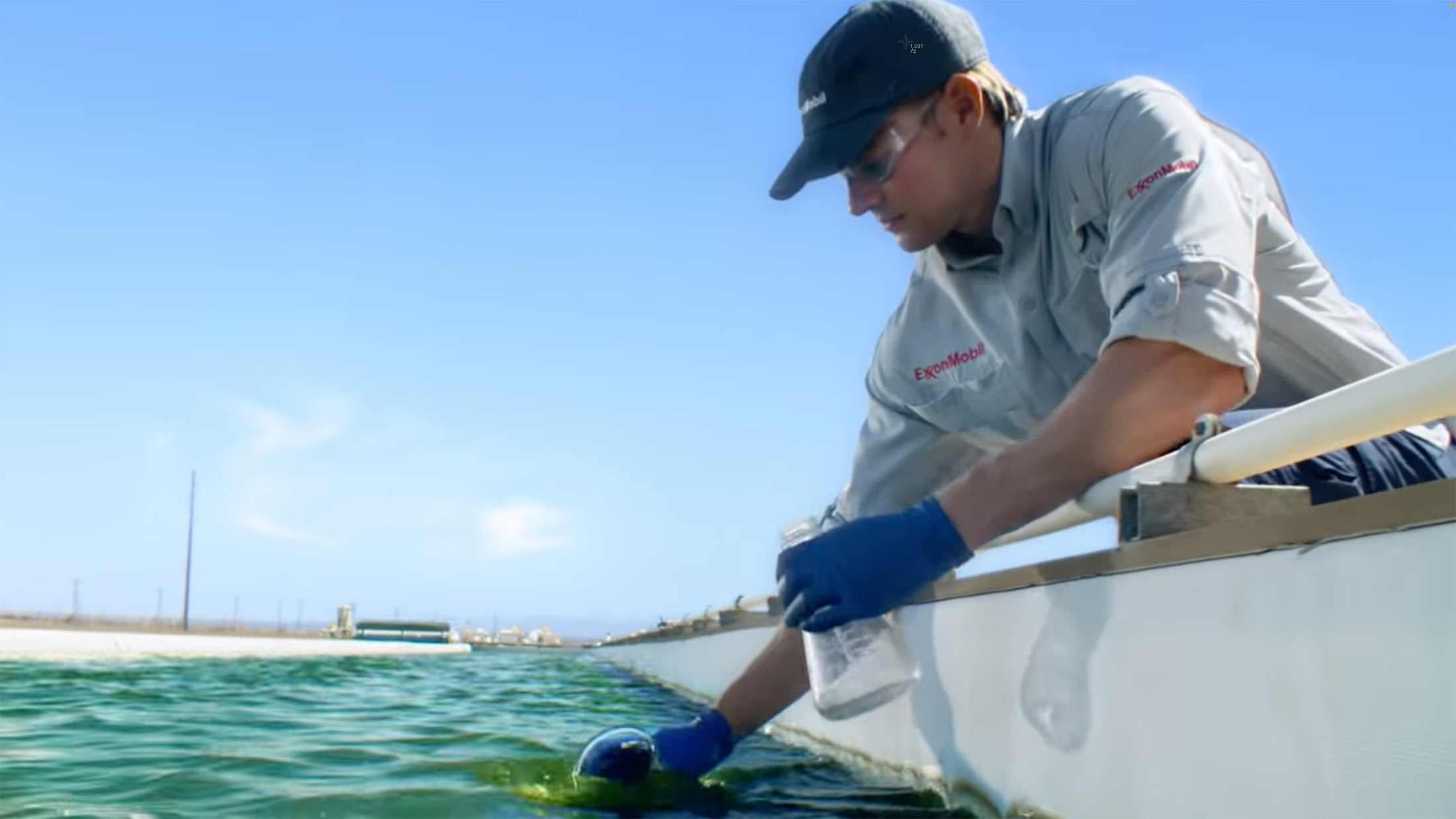 埃克森广告展示了加利福尼亚州卡利帕特里亚的Viridos设施的室外藻类池塘。