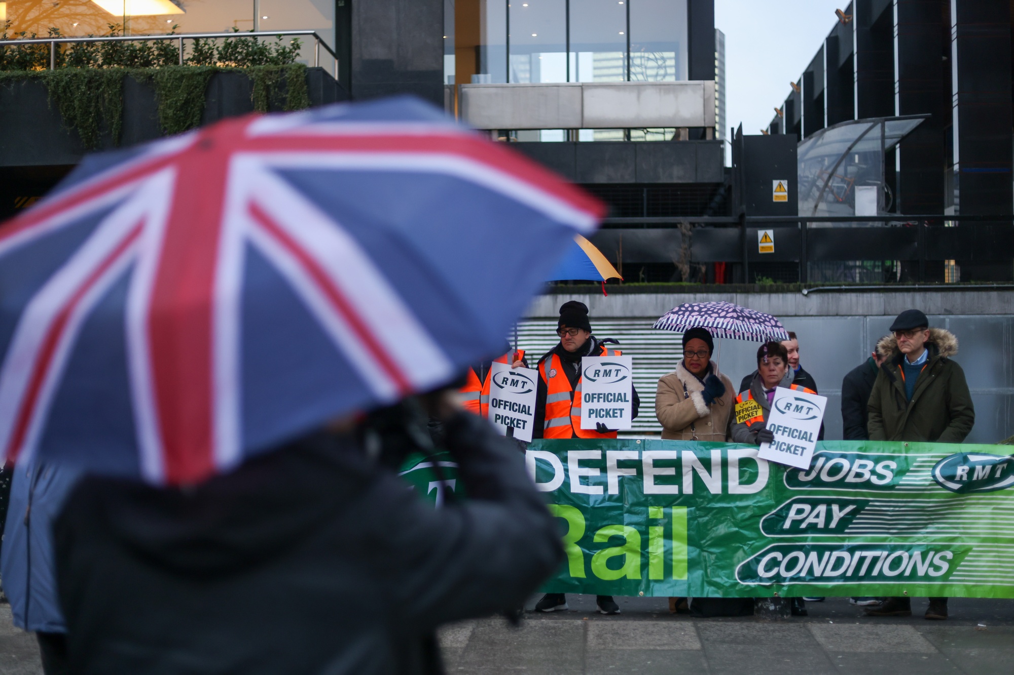 英国铁路、海事和运输工会(RMT)成员在伦敦尤斯顿火车站外举行罢工行动,日期为1月3日。