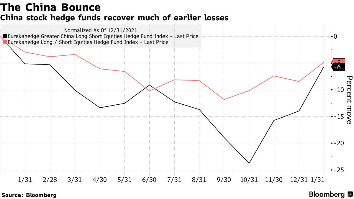 北京突然放弃COVID零政策提振了市场,支撑着对消费和生产增长的预期。Eurekahedge Pte 对中国股票对冲基金表现的衡量在截至1月的三个月内上涨了24%,是全球平均水平的四倍。