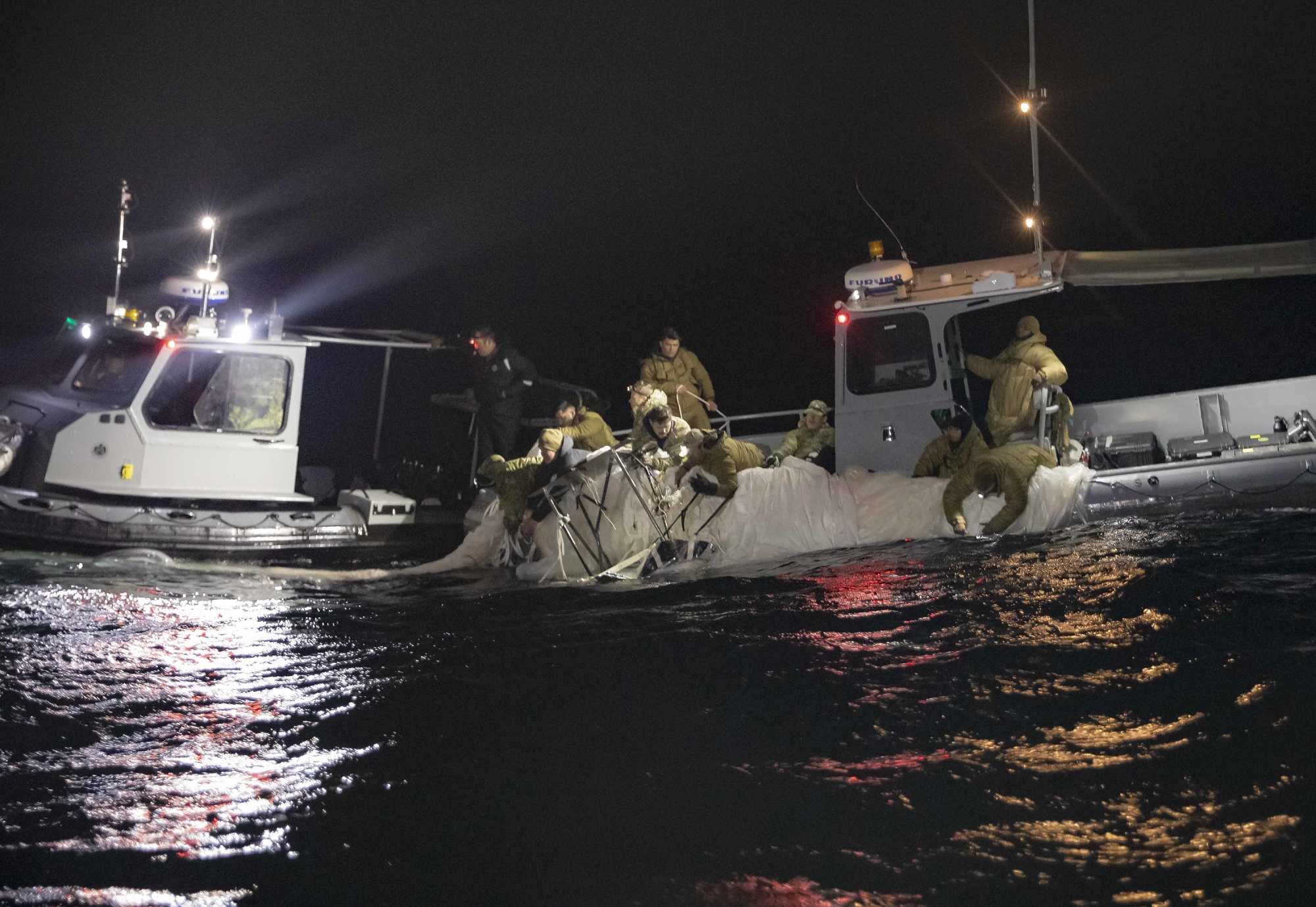 2号爆炸物处理组的水手们在2月5日在南卡罗来纳州默特尔比奇海岸附近回收了高空监视气球。摄影师:泰勒·汤普森一等兵/美国海军联邦调查局发布的照片显示特工们正在检查气球的白色气罩,并帮助指引船只在水域中寻找新的材料。在周四的电话会议上,FBI官员告诉记者,该局尚未接触到气球的主要有效载荷。