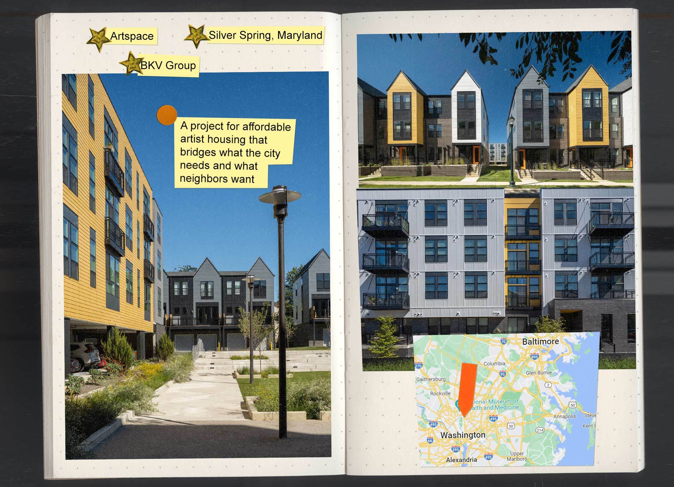 照片:BKV Group。插图:Stephanie DavidsonArtspace Silver Spring于2020年完工,是一个综合艺术家园区,包括一个四层公寓大楼,共有68个经济实惠单元和11个待售联排别墅环绕中央庭院。每个公寓单元的申请者收入限制在该地区收入中位数的60%以下,并优先考虑艺术家。