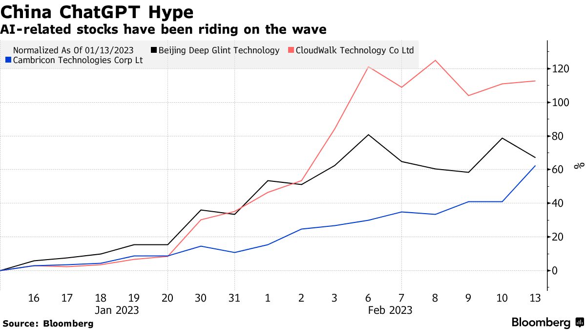 即使监管机构的警告也未能减弱围绕ChatGPT股票的热情。上周至少有三家公司的股价连续三个交易日上涨超过30%,引起了当地证券交易所的询问。一家中国报纸在头版评论中警告投资者不要盲目加入投机狂潮。
