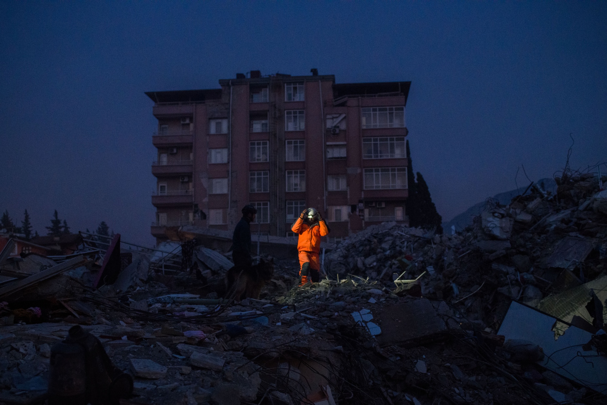 志愿者在土耳其哈塔伊一处倒塌的住宅楼现场进行救援工作。摄影师:Nathan Laine/Bloomberg