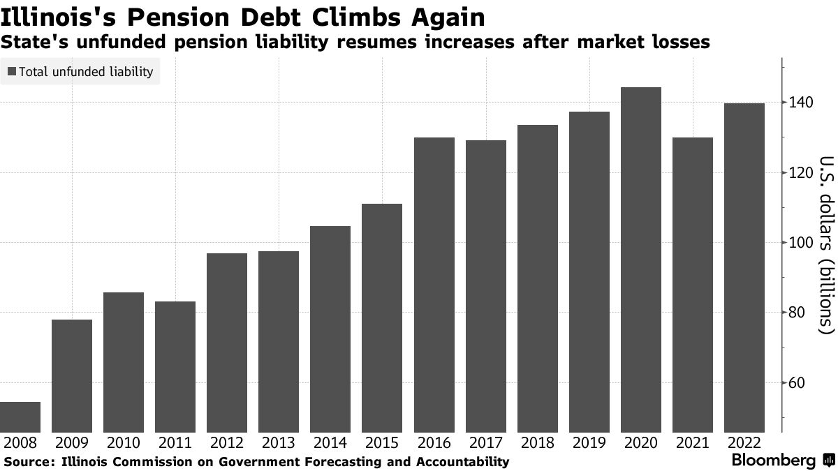 根据伊利诺伊政府预测和责任委员会的数据,截至6月结束的财政年度,伊利诺伊州五个退休制度的未偿养老金负债按其资产的市场价值增加了7.5%,达到了1,397亿美元。这与2021年相比有所变化,当时随着股票价格上涨,养老金债务有所下降。