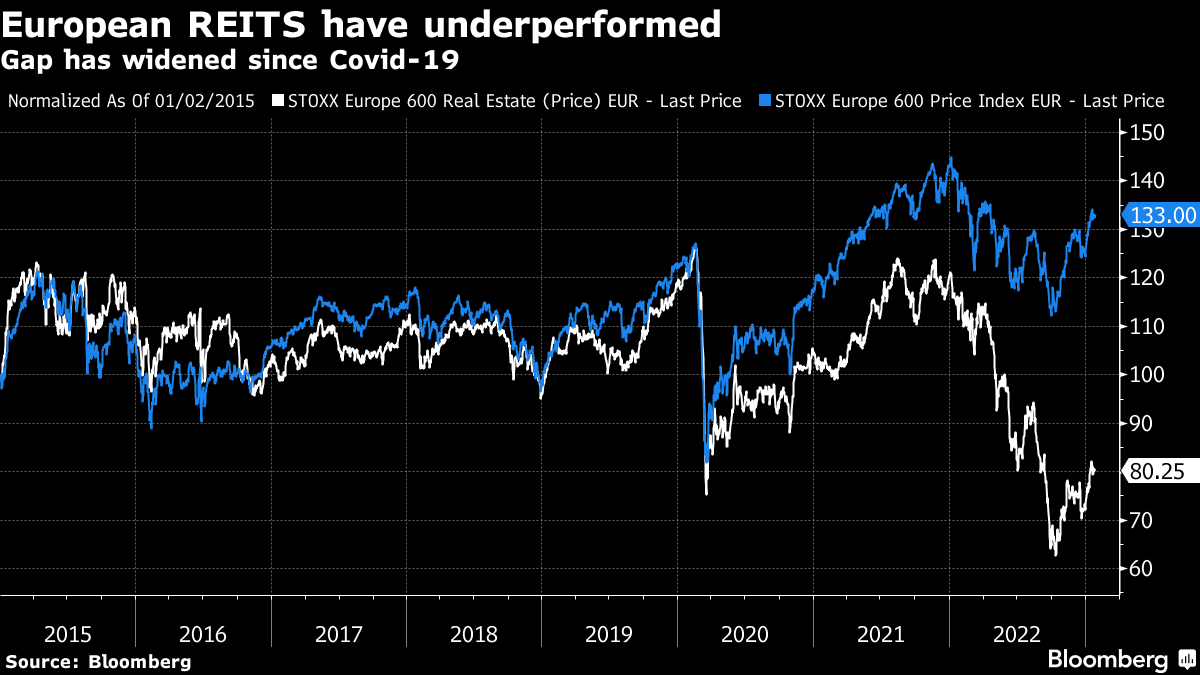 然而,彭博智库高级分析师苏·蒙登在上个月的一份报告中写道,欧洲房地产投资信托股票的表现短期内不太可能改善。英国和欧元区在通胀方面的困境将继续推高利率,而下半年的表现将取决于经济的改善,她写道。