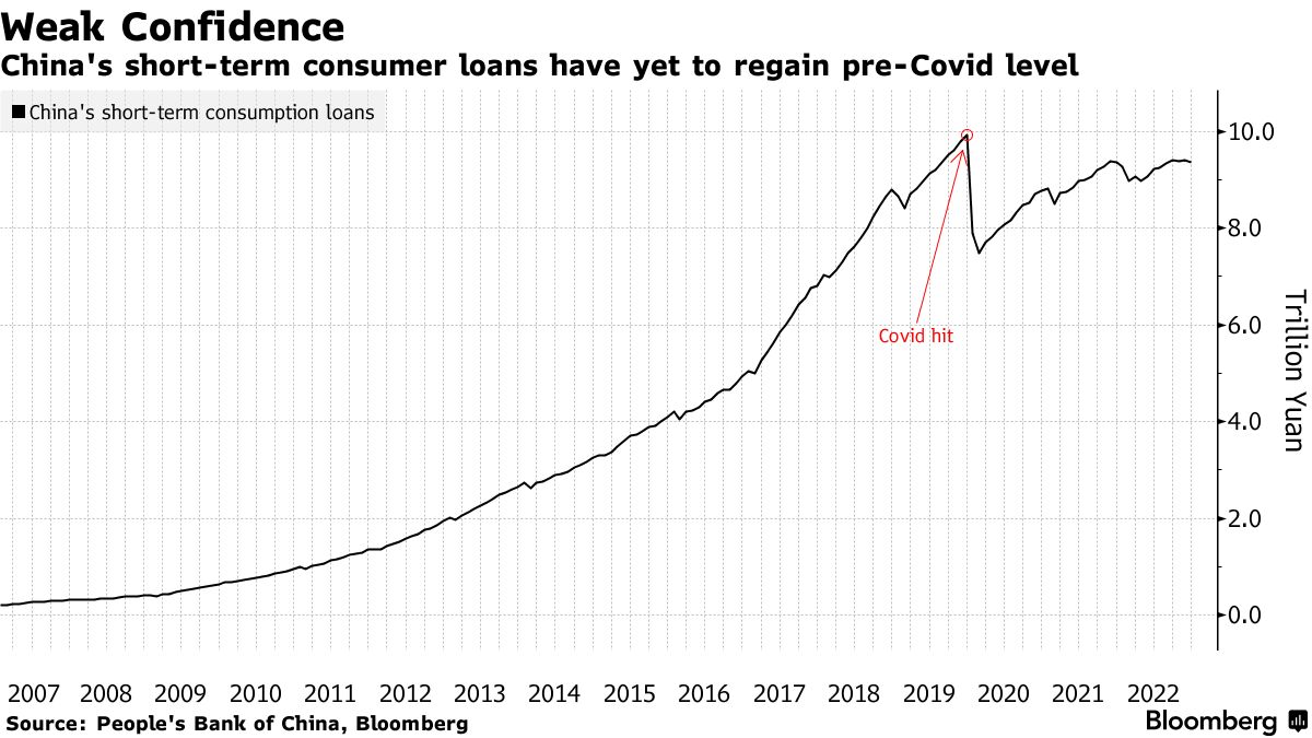 中国消费者信心在新冠疫情爆发后受到打击,短期消费信贷余额从2019年底的峰值暴跌。相比之下,家庭积累了一大笔储蓄。