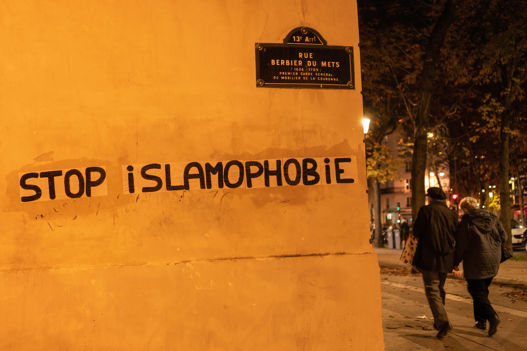 人们走过巴黎的涂鸦,上面写着“停止伊斯兰恐惧症”。