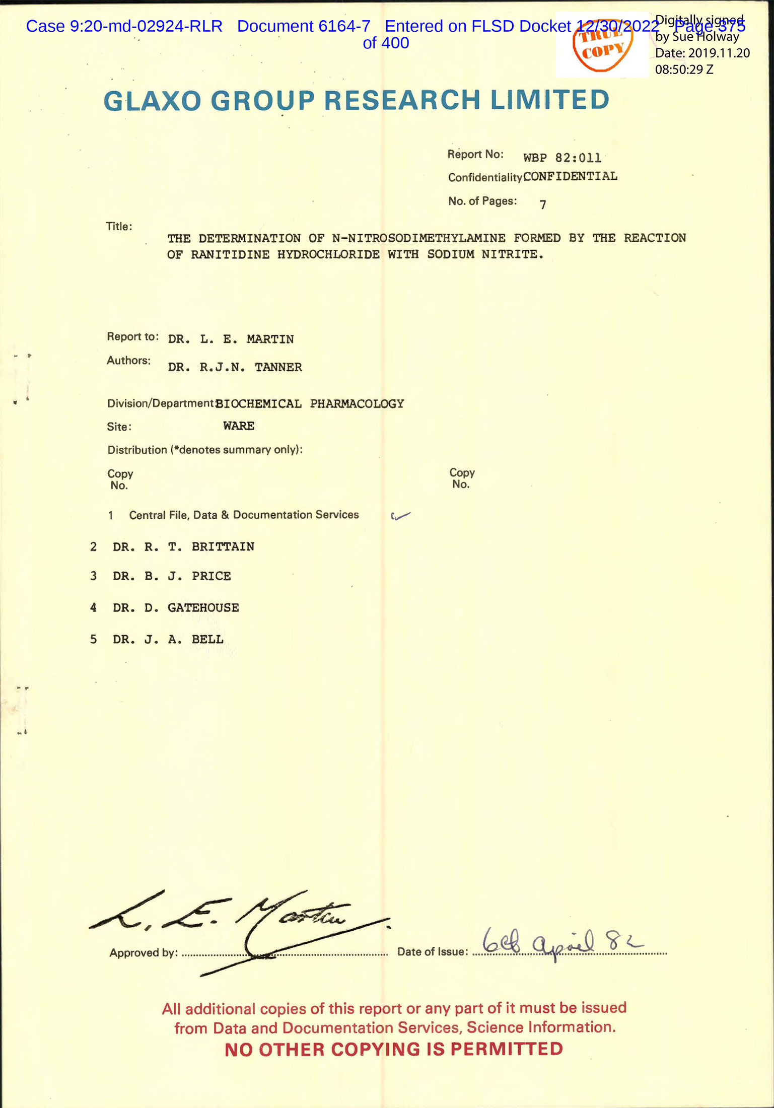 在葛兰素史克公司持怀疑态度是很自然的。一家公司测试了一种竞争产品并发现了一个缺陷。葛兰素史克要求其中一位科学家进行自己的测试:理查德·坦纳,他在生化药理学部门工作。他得到了相同的结果。他在一些样本中发现了高达232,000纳克的NDMA。后来,当美国食品药品监督管理局认为任何药物中含有微量的NDMA是可以接受的时,这个数量是96纳克。坦纳在使用较低的亚硝酸盐水平时没有发现NDMA,而公司现在表示这更接近于实际人类胃部的条件。但是根据1982年的法庭文件显示,葛兰素史克公司保密了这项研究。美国临床研究副主任从未被告知坦纳的报告。胃肠研究的高级医学顾问也不知情。美国食品药品监督管理局也不知情。