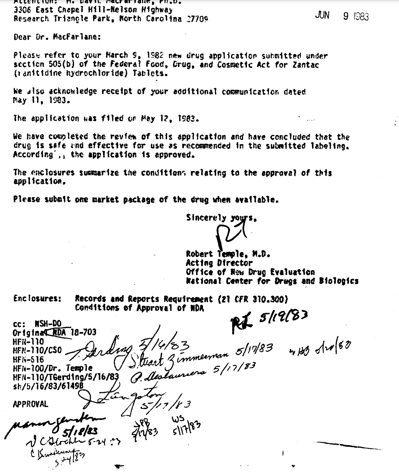 事实上,讨论已经超越了对癌症的任何担忧,转向了具体的用药剂量和赞他可将治疗的溃疡类型。关于药物需要如何运输和储存,以及标签上是否应该有任何警告,几乎没有讨论。讨论进行得很快。午餐休息前,外部专家投票建议FDA批准这种药物:每天150毫克,每次两次,最多治疗八周,用于治疗急性十二指肠溃疡,这是最常见的类型。最终标签将包括指示将药丸存放在家中不超过86华氏度的干燥地方。一年后,即1983年5月,FDA批准葛兰素出售赞他可。《纽约时报写道,这种药物已在31个国家销售,比泰格美更强大几倍,据说副作用更少,尽管这两种药物被认为非常安全,医生已经为更广泛范围的胃部问题开过这两种药物,而不仅仅是公司建议的范围。