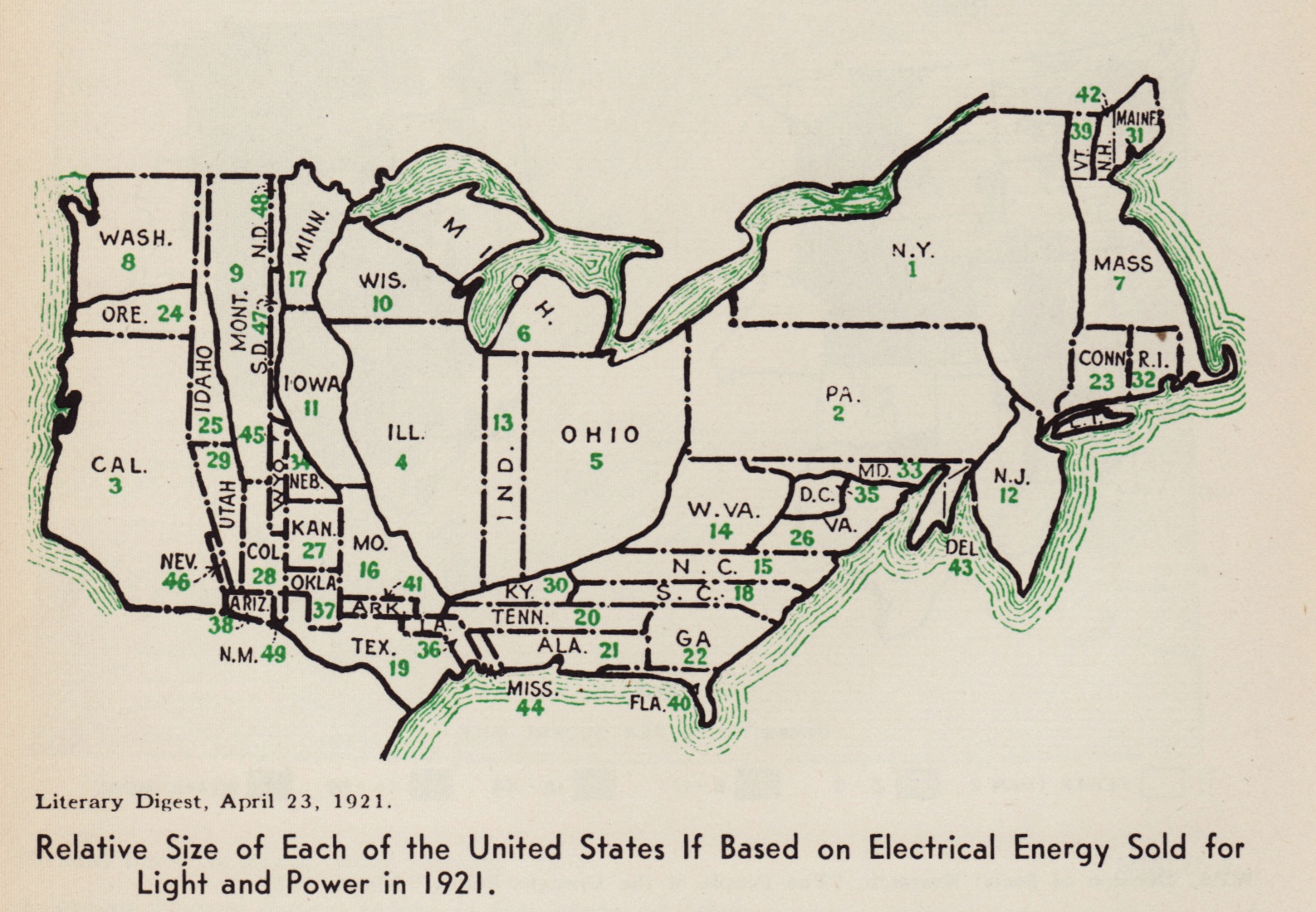 杂志Literary Digest在1921年发表了一幅引人入胜的地图,展示了美国各州根据各自的电力消耗量而描绘的情况。不出所料,纽约是最大的,其次是宾夕法尼亚州,然后是加利福尼亚州。相比之下,农村南部微小,而达科他州、新墨西哥州和怀俄明州几乎看不见。特别是在南部,州人口与电力消耗之间存在明显的不匹配:密西西比州在1920年人口排名第23位,但在电力销售方面排名第44位。