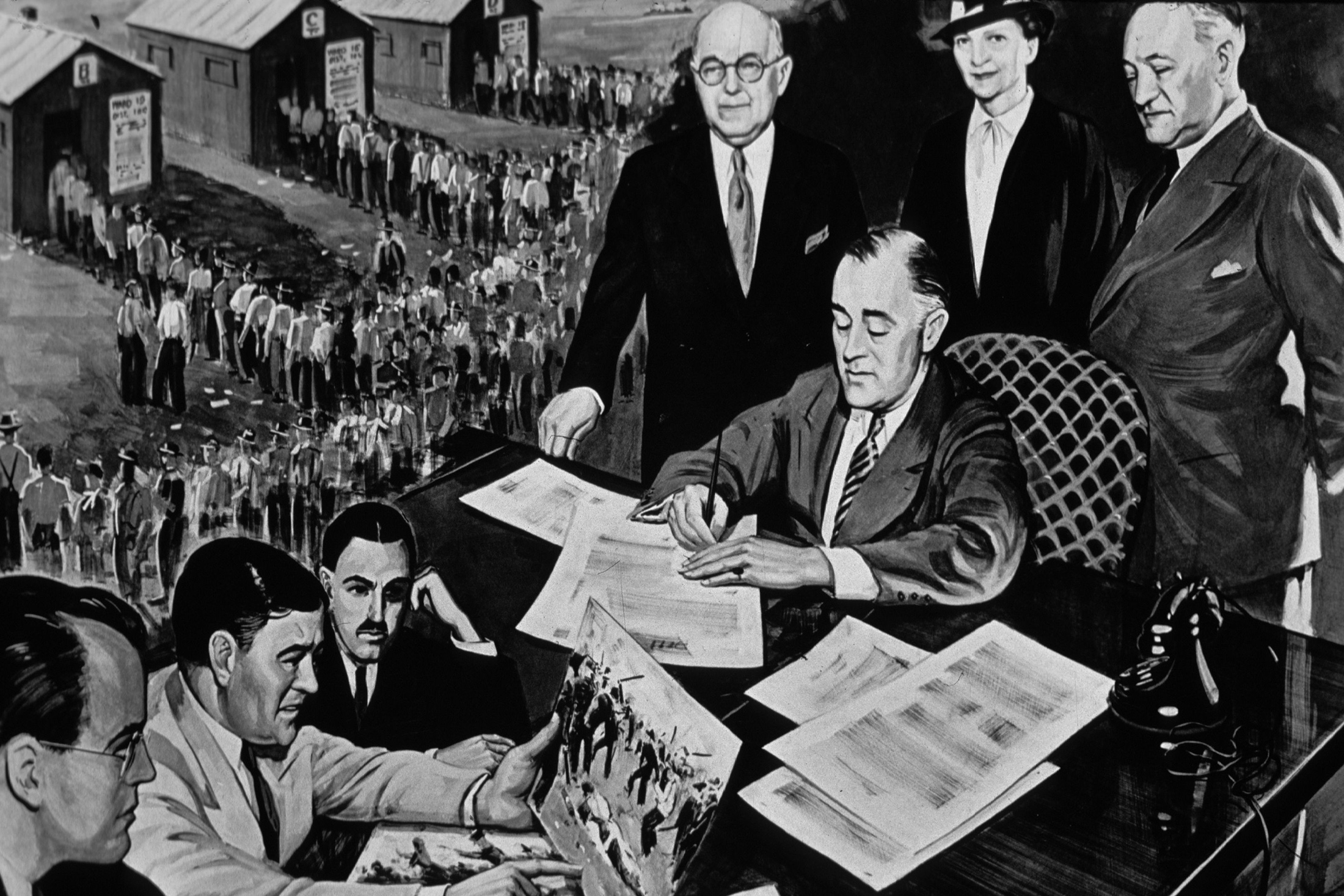 富兰克林·德拉诺·罗斯福总统实施了新政,一系列的救济、复苏和改革计划。