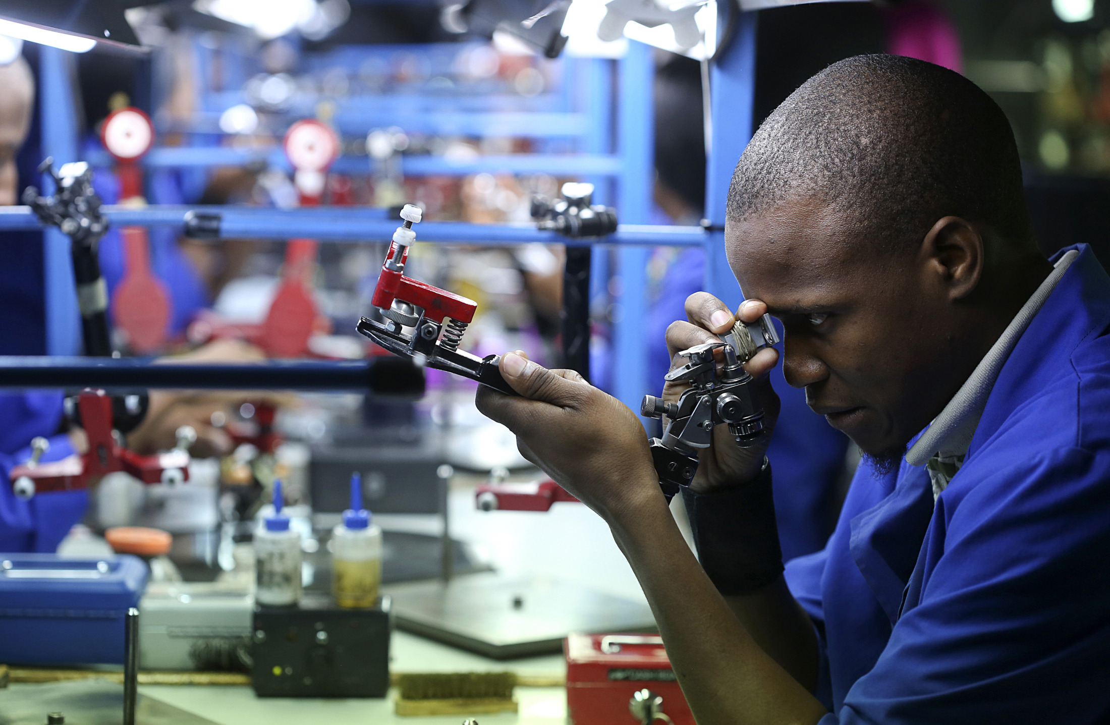 一名员工在博茨瓦纳加博罗内进行最后的抛光前检查一颗钻石。