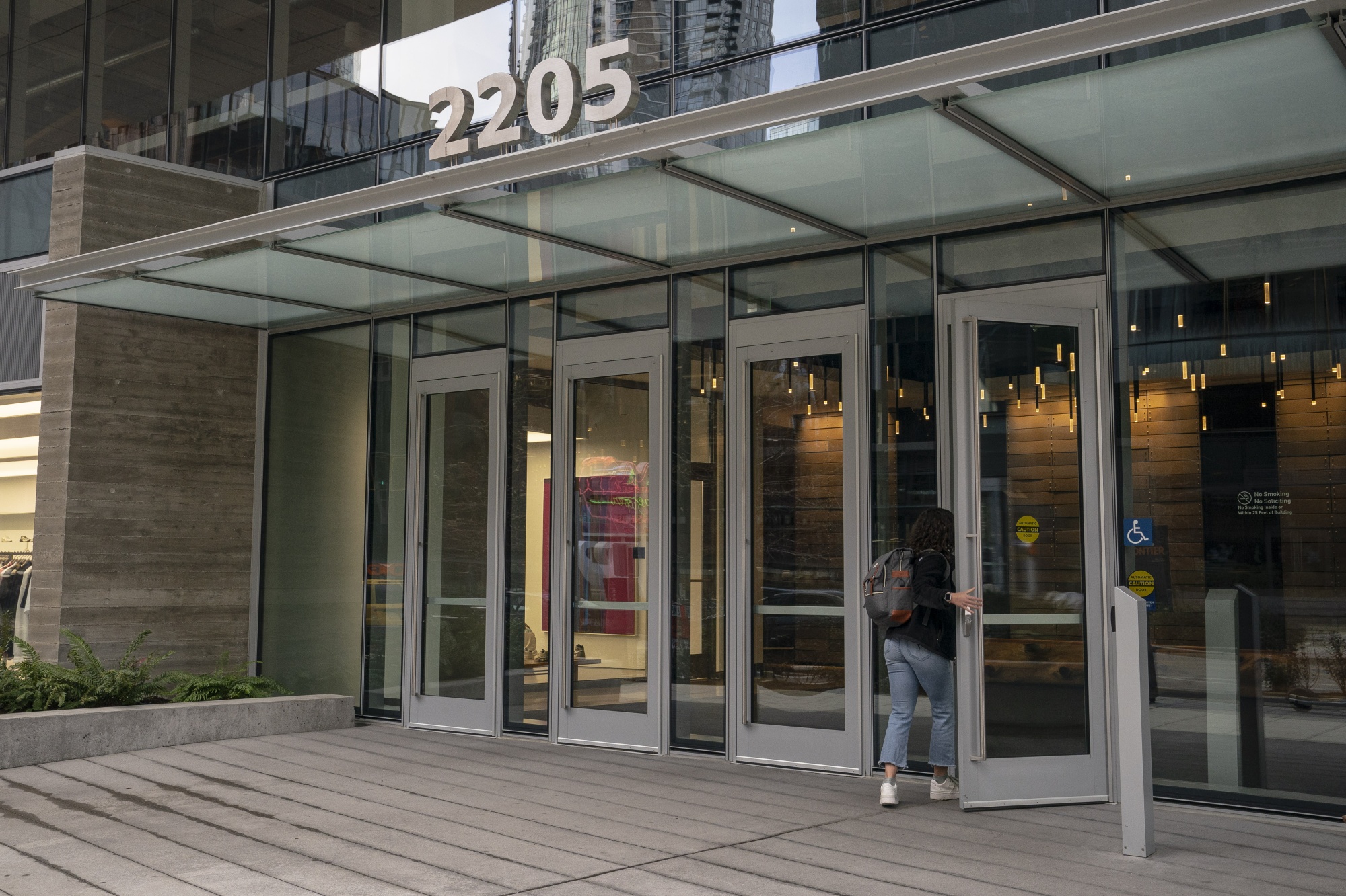 一名工人进入了亚马逊总部所在的西雅图南湖联合社区。