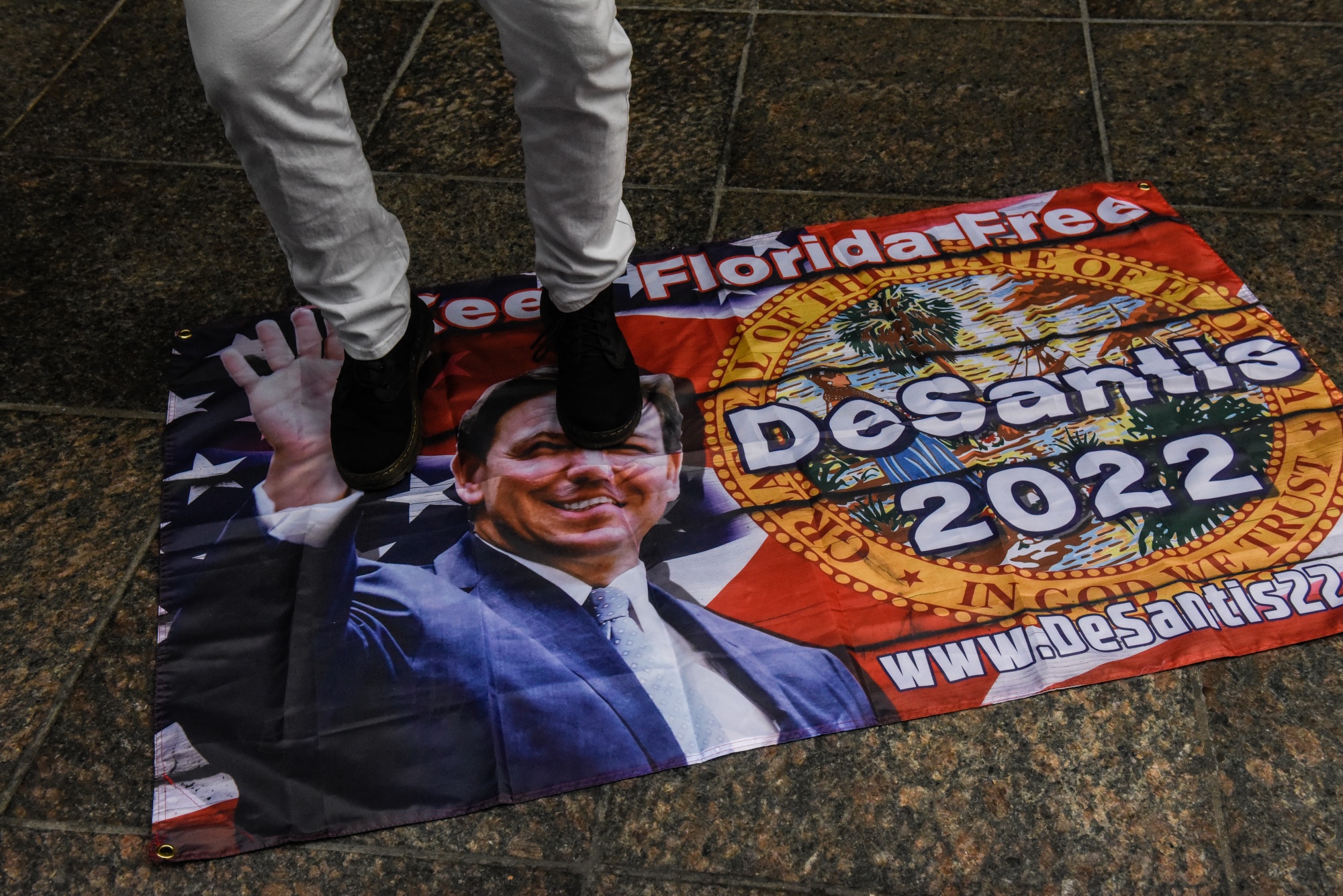 一名示威者在前总统特朗普在纽约特朗普大厦宣布之前踩踏德桑蒂斯州长的旗帜,时间为2022年11月15日。摄影师:斯蒂芬妮·基思/彭博社德桑蒂斯的女发言人拒绝就特朗普的攻击发表评论。德桑蒂斯表示,选民在投票时会对执行官处理危机的方式做出评判。
